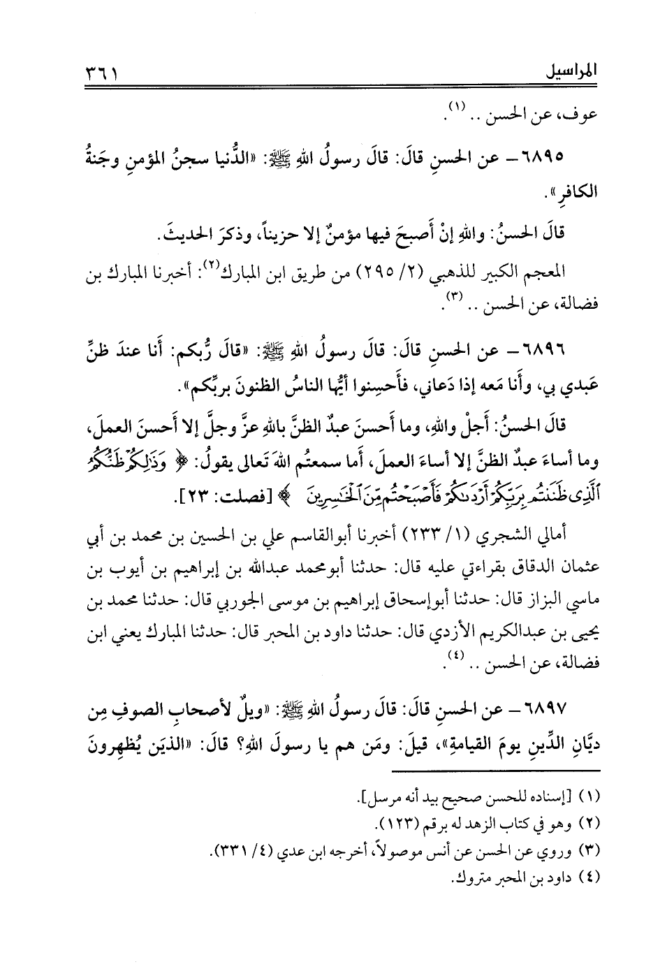 6897 - عن الحسنِ قالَ: قالَ رسولُ اللهِ صلى الله عليه وسلم: «ويلٌ لأصحابِ الصوفِ مِن ديَّانِ الدِّينِ يومَ القيامةِ»، قيلَ: ومَن هم يا رسولَ اللهِ؟ قالَ: «الذيَن يُظهِرونَ