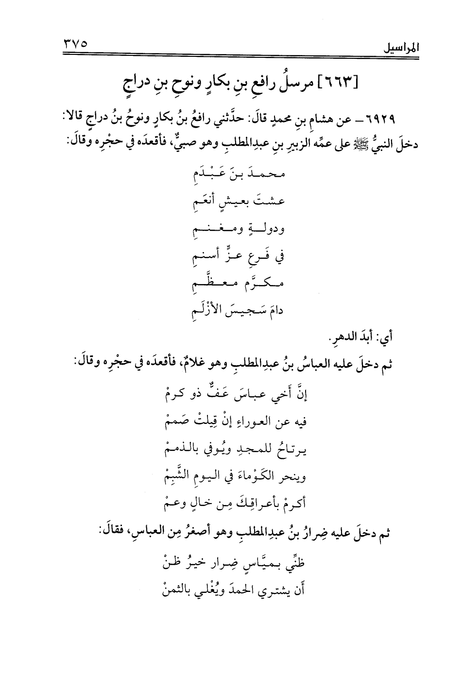 6929 - عن هشامِ بنِ محمدٍ قالَ: حدَّثني رافعُ بنُ بكارٍ ونوحُ بنُ دراجٍ قالا: دخلَ النبيُّ صلى الله عليه وسلم على عمِّه الزبيرِ بنِ عبدِالمطلبِ وهو صبيٌّ، فأقعدَه في حجْرِه وقالَ: