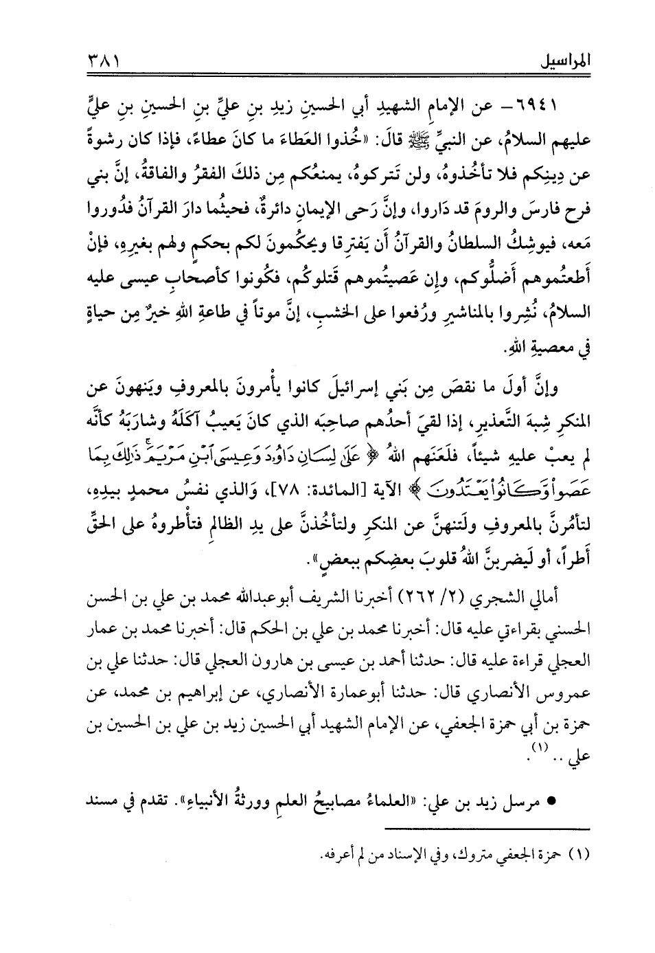 6941 - عن الإمامِ الشهيدِ أبي الحسينِ زيدِ بنِ عليِّ بنِ الحسينِ بنِ عليٍّ عليهم السلامُ، عن النبيِّ صلى الله عليه وسلم قالَ: «خُذوا العَطاءَ ما كانَ عطاءً، فإذا كان رشوةً عن دِينِكم فلا تأخُذوهُ، ولن تَتركوهُ يمنعُكم مِن ذلكَ الفقرُ والفاقةُ، إنَّ بني فرح فارسَ والرومَ قد دَاروا، وإنَّ رَحى الإيمانِ دائرةٌ، فحيثُما دارَ القرآنُ فدُوروا مَعه، فيوشِكُ السلطانُ والقرآنُ أَن يَفترِقا ويحكُمونَ لكم بحكمٍ ولهم بغيرِهِ، فإنْ أَطعتُموهم أَضلُّوكم، وإِن عَصيتُموهم قَتلوكُم، فكُونوا كأصحابِ عيسى عليه السلامُ، نُشِروا بالمناشيرِ ورُفعوا على الخشبِ، إنَّ موتاً في طاعةِ اللهِ خيرٌ مِن حياةٍ في معصيةِ اللهِ.