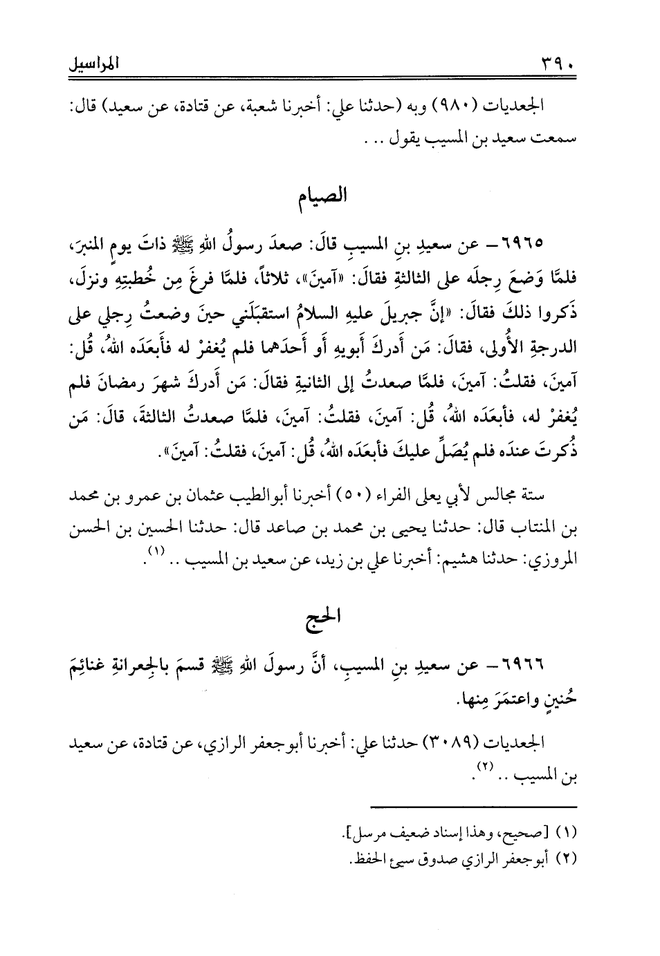 ستة مجالس لأبي يعلى الفراء (50) أخبرنا أبوالطيب عثمان بن عمرو بن محمد بن المنتاب قال: حدثنا يحيى بن محمد بن صاعد قال: حدثنا الحسين بن الحسن المروزي: حدثنا هشيم: أخبرنا علي بن زيد، عن سعيد بن المسيب .. (¬1).