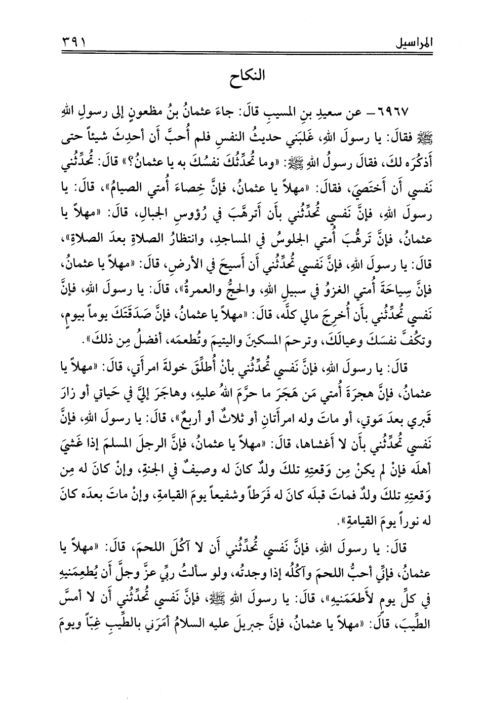 6967 - عن سعيدِ بنِ المسيبِ قالَ: جاءَ عثمانُ بنُ مظعونٍ إلى رسولِ اللهِ صلى الله عليه وسلم فقالَ: يا رسولَ اللهِ، غَلبَني حديثُ النفسِ فلم أُحبَّ أَن أحدِثَ شيئاً حتى أَذكُرَه لكَ، فقالَ رسولُ اللهِ صلى الله عليه وسلم: «وما تُحدِّثُكَ نفسُكَ به يا عثمانُ؟» قالَ: تُحدِّثُني نَفسي أَن أَختَصيَ، فقالَ: «مهلاً يا عثمانُ، فإنَّ خِصاءُ أُمتي الصيامُ»، قالَ: يا رسولَ اللهِ، فإنَّ نَفسي تُحدِّثُني بأَن أَترهَّبَ في رُؤوسِ الجبالِ، قالَ: «مهلاً يا عثمانُ، فإنَّ تَرهُّبَ أُمتي الجلوسُ في المساجدِ، وانتظارُ الصلاةِ بعدَ الصلاةِ»، قالَ: يا رسولَ اللهِ، فإنَّ نَفسي تُحدِّثُني أَن أَسيحَ في الأرضِ، قالَ: «مهلاً يا عثمانُ، فإنَّ سِياحَةَ أُمتي الغزوُ في سبيلِ اللهِ، والحجُّ والعمرةُ»، قالَ: يا رسولَ اللهِ، فإنَّ نَفسي تُحدِّثُني بأَن أُخرِجَ مالي كلَّه، قالَ: «مهلاً يا عثمانُ، فإنَّ صَدَقَتَكَ يوماً بيومٍ، وتكُفَّ نفسَكَ وعيالَكَ، وترحمَ المسكينَ واليتيمَ وتُطعمَه، أفضلُ مِن ذلكَ».