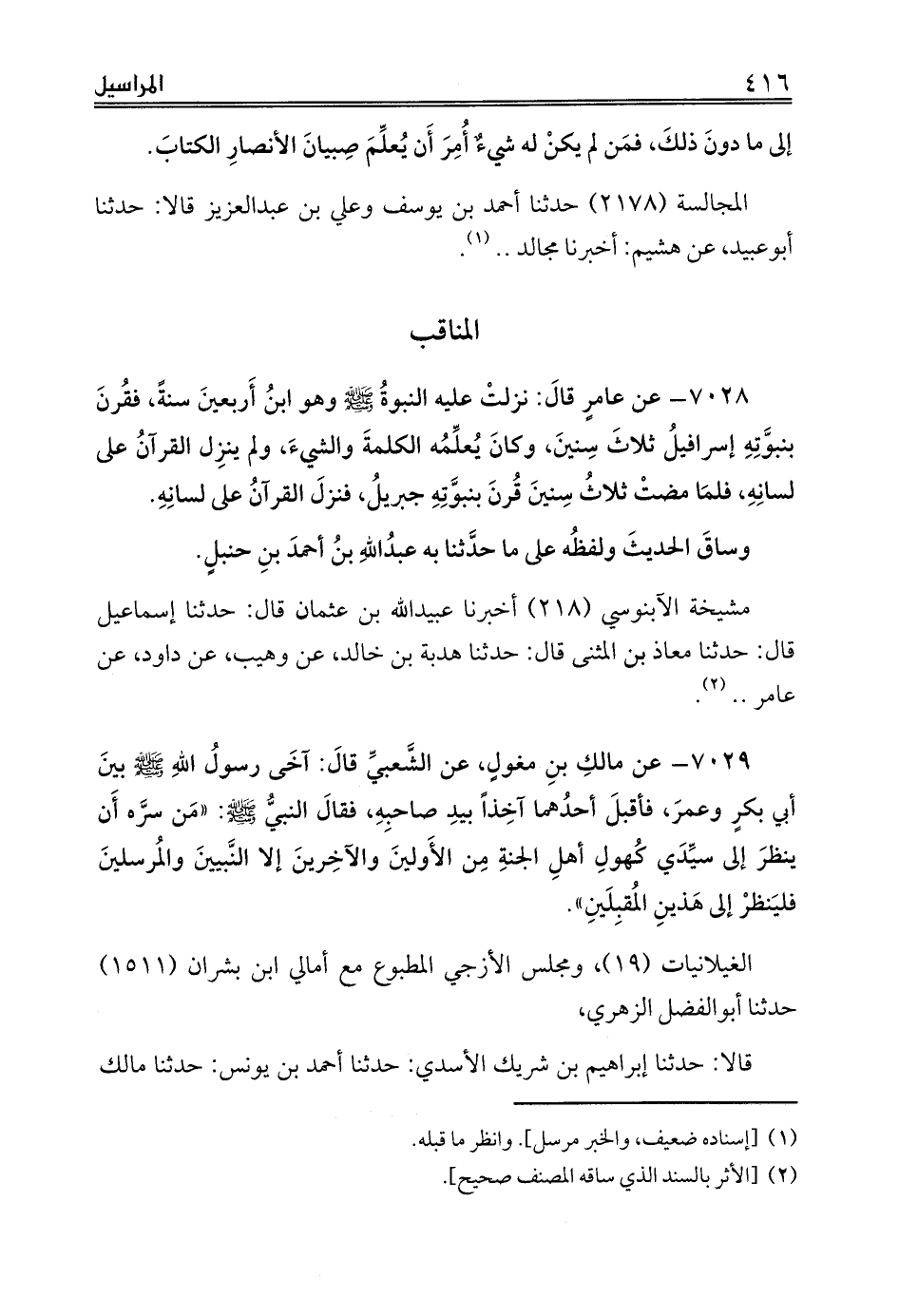 المجالسة (2178) حدثنا أحمد بن يوسف وعلي بن عبدالعزيز قالا: حدثنا أبوعبيد، عن هشيم: أخبرنا مجالد .. (¬1).