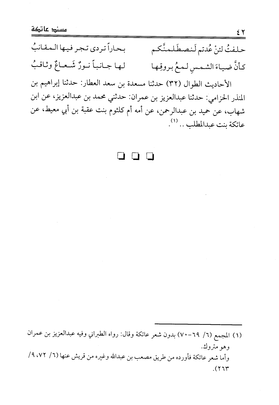 (¬1) المجمع (6/ 69 - 70) بدون شعر عاتكة وقال: رواه الطبراني وفيه عبدالعزيز بن عمران وهو متروك.