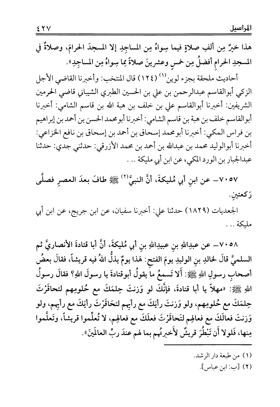 7057 - عن ابنِ أبي مُليكةَ، أنَّ النبيَّ (¬2) صلى الله عليه وسلم طافَ بعدَ العصرِ فصلَّى رَكعتينِ.