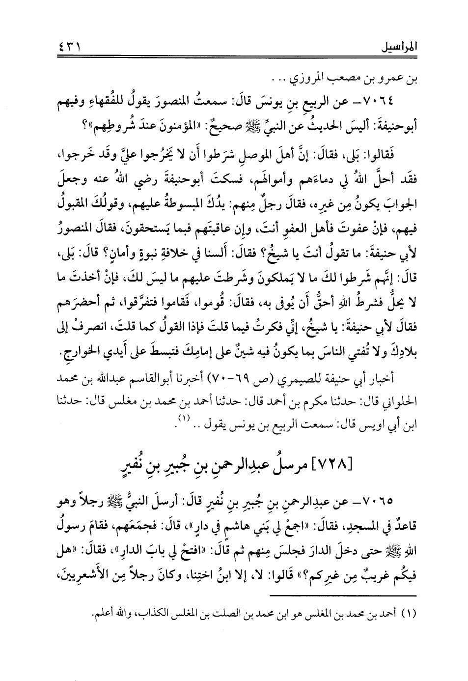 [728] مرسلُ عبدِالرحمنِ بنِ جُبيرِ بنِ نُفيرٍ