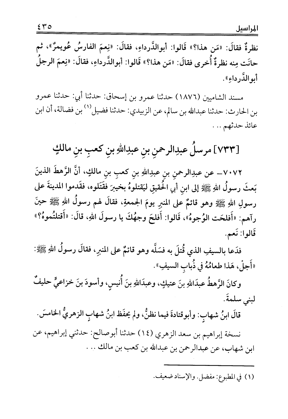 [733] مرسلُ عبدِالرحمنِ بنِ عبدِاللهِ بنِ كعبِ بنِ مالكٍ