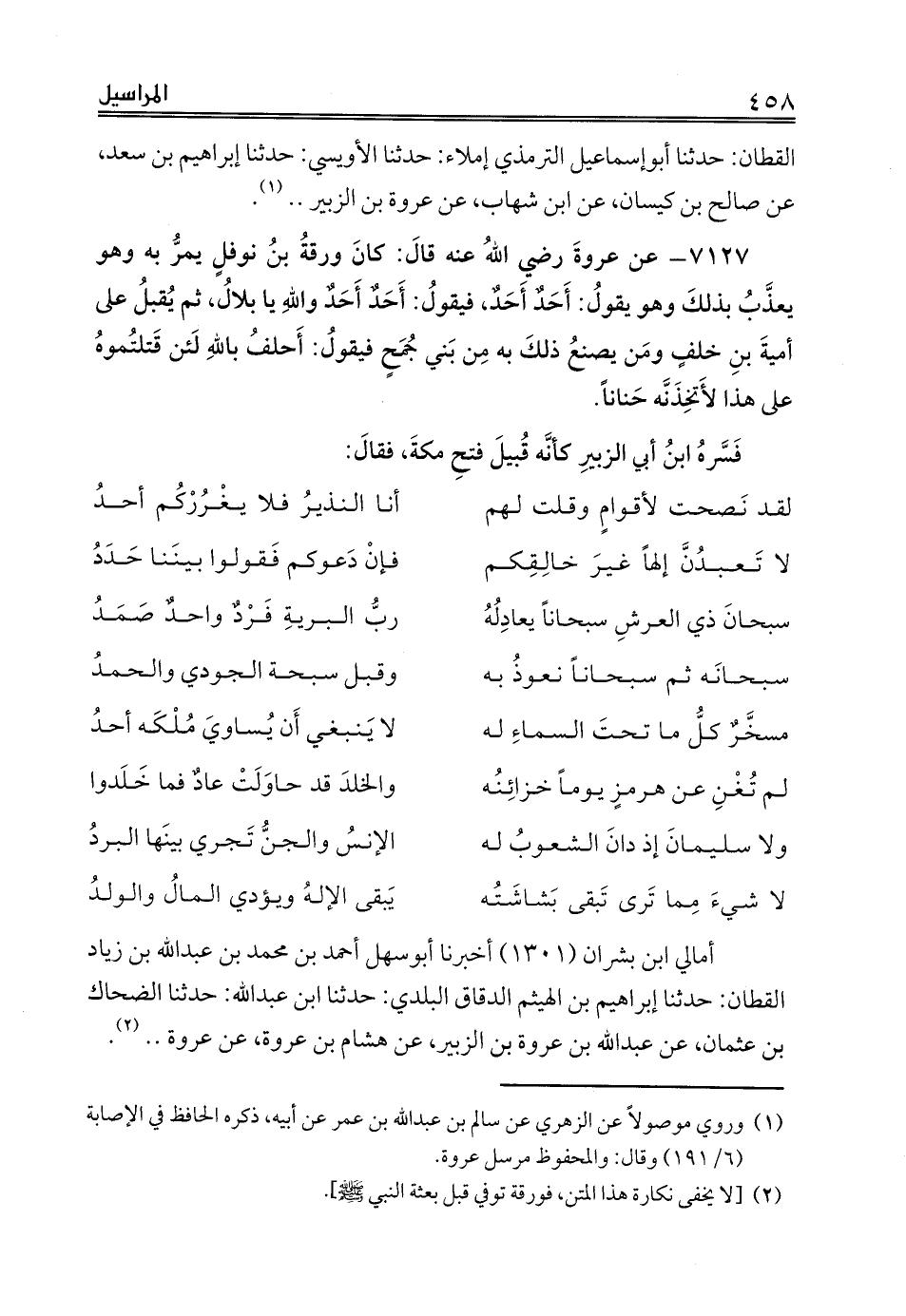 7127 - عن عروةَ رضي اللهُ عنه قالَ: كانَ ورقةُ بنُ نوفلٍ يمرُّ به وهو يعذَّبُ بذلكَ وهو يقولُ: أَحَدٌ أَحَدٌ، فيقولُ: أَحَدٌ أَحَدٌ واللهِ يا بلالُ، ثم يُقبلُ على أميةَ بنِ خلفٍ ومَن يصنعُ ذلكَ به مِن بَني جُمَحٍ فيقولُ: أَحلفُ باللهِ لَئن قَتلتُموهُ على هذا لأَتخِذَنَّه حَناناً.
