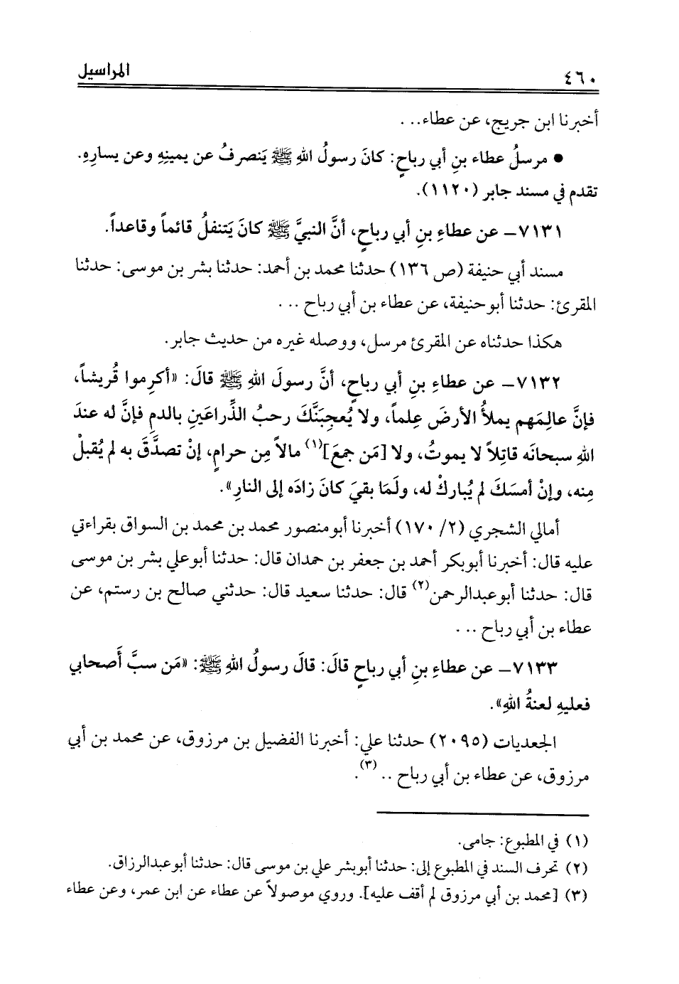 أمالي الشجري (2/ 170) أخبرنا أبومنصور محمد بن محمد بن السواق بقراءتي عليه قال: أخبرنا أبوبكر أحمد بن جعفر بن حمدان قال: حدثنا أبوعلي بشر بن موسى قال: حدثنا أبوعبدالرحمن (¬2) قال: حدثنا سعيد قال: حدثني صالح بن رستم، عن عطاء بن أبي رباح .. .