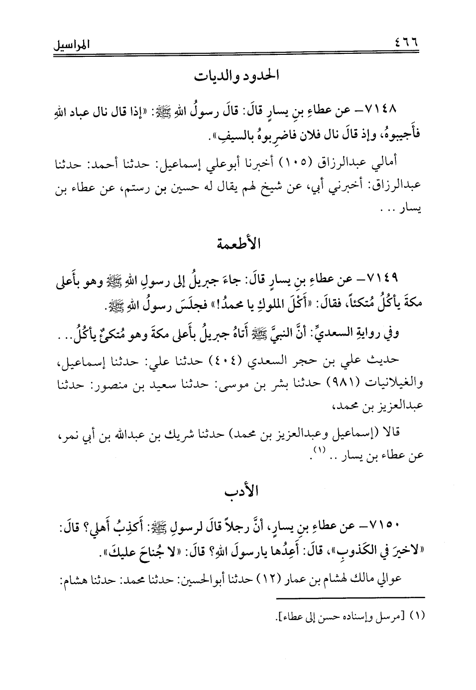 7148 - عن عطاءِ بنِ يسارٍ قالَ: قالَ رسولُ اللهِ صلى الله عليه وسلم: «إذا قال نال عباد اللهِ فأَجيبوهُ، وإذ قالَ نال فلان فاضرِبوهُ بالسيفِ».