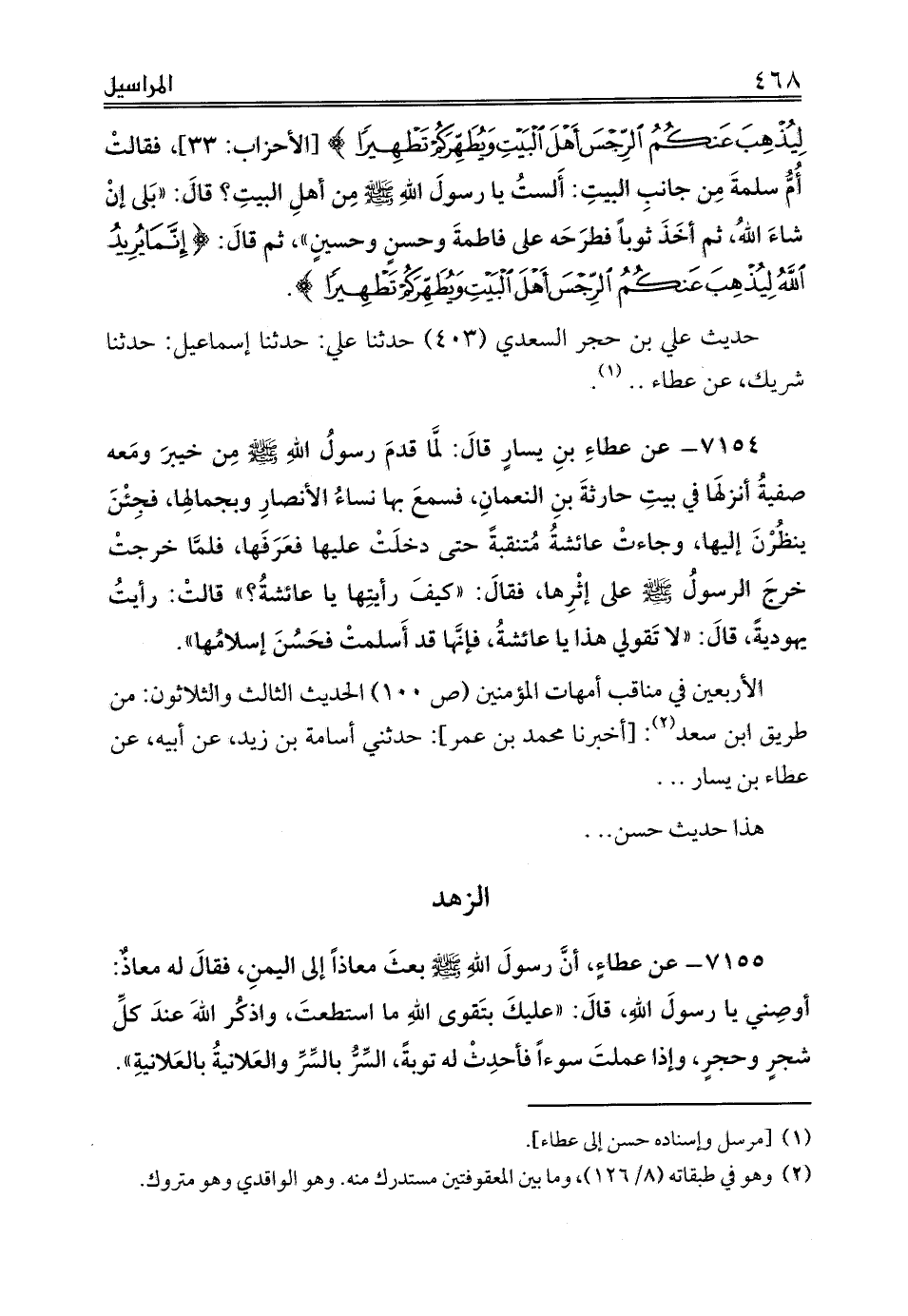 الأربعين في مناقب أمهات المؤمنين (ص 100) الحديث الثالث والثلاثون: من طريق ابن سعد (¬2): حدثني أسامة بن زيد، عن أبيه، عن عطاء بن يسار .. .
