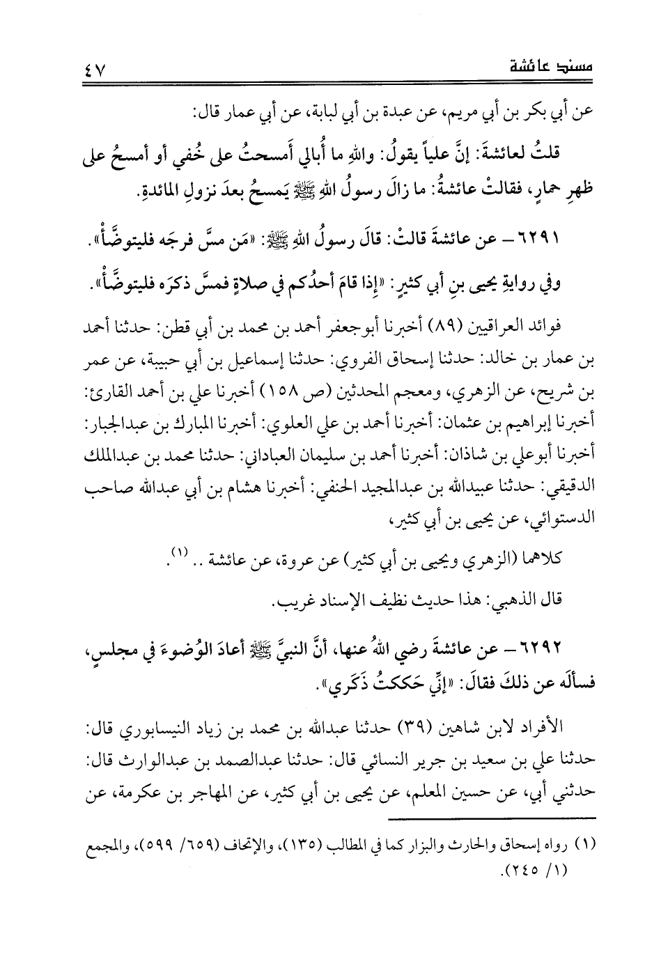الأفراد لابن شاهين (39) حدثنا عبدالله بن محمد بن زياد النيسابوري قال: حدثنا علي بن سعيد بن جرير النسائي قال: حدثنا عبدالصمد بن عبدالوارث قال: حدثني أبي، عن حسين المعلم، عن يحيى بن أبي كثير، عن المهاجر بن عكرمة، عن الزهري، عن عروة، عن عائشة .. (¬2).