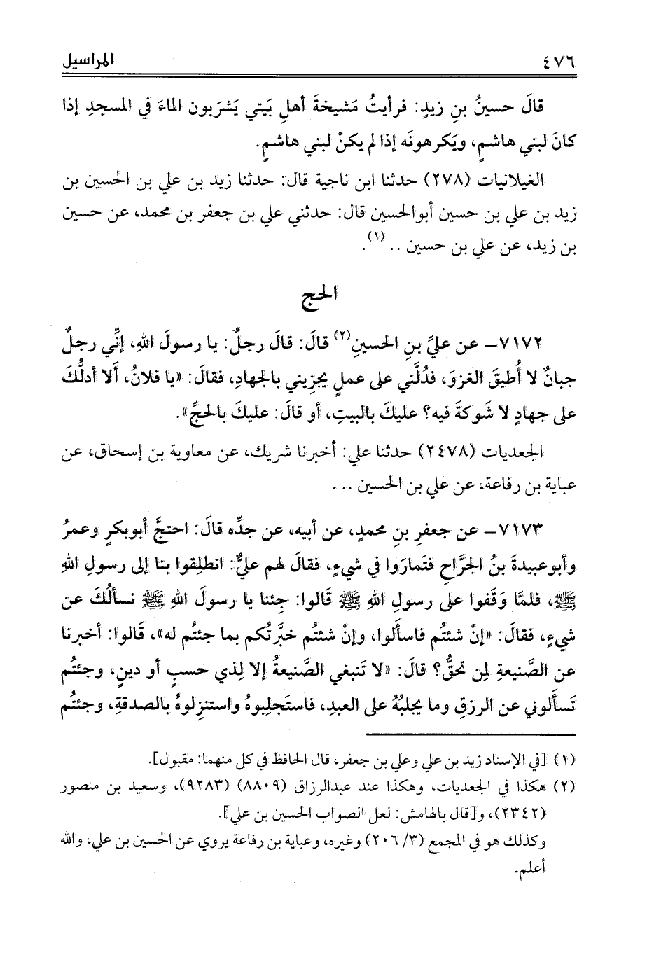 الغيلانيات (278) حدثنا ابن ناجية قال: حدثنا زيد بن علي بن الحسين بن زيد بن علي بن حسين أبوالحسين قال: حدثني علي بن جعفر بن محمد، عن حسين بن زيد، عن علي بن حسين .. (¬1).