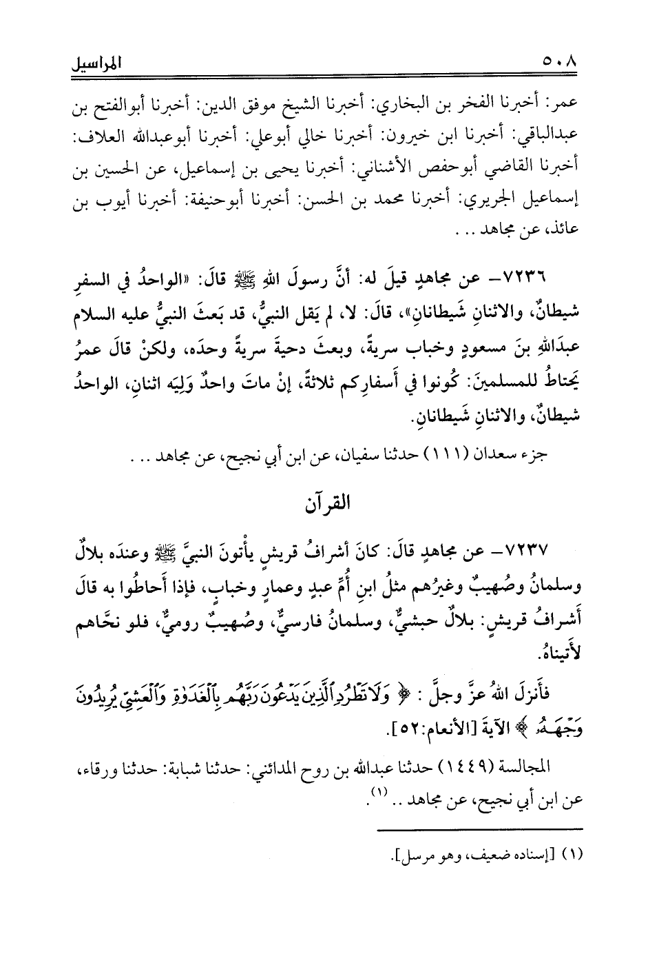 7236 - عن مجاهدٍ قيلَ له: أنَّ رسولَ الله صلى الله عليه وسلم قالَ: «الواحدُ في السفرِ شيطانٌ، والاثنانِ شَيطانانِ»، قالَ: لا، لم يَقل النبيُّ، قد بَعثَ النبيُّ عليه السلام عبدَاللهِ بنَ مسعودٍ وخباب سريةً، وبعثَ دحيةَ سريةً وحدَه، ولكنْ قالَ عمرُ يَحتاطُ للمسلمينَ: كُونوا في أَسفارِكم ثلاثةً، إنْ ماتَ واحدٌ وَلِيَه اثنانِ، الواحدُ شيطانٌ، والاثنانِ شَيطانانِ.