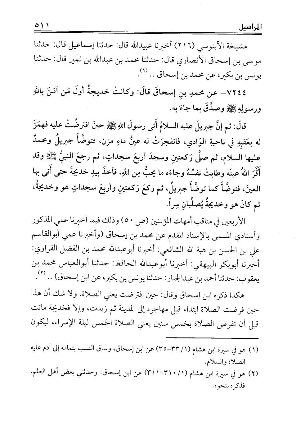 الأربعين في مناقب أمهات المؤمنين (ص 50) وذلك فيما أخبرنا عمي المذكور وأستاذي المسمى بالإسناد المقدم عن محمد بن إسحاق (وأخبرنا عمي أبوالقاسم علي بن الحسن بن هبة الله الشافعي: أخبرنا أبوعبدالله محمد بن الفضل الفراوي: أخبرنا أبوبكر البيهقي: أخبرنا أبوعبدالله الحافظ: حدثنا أبوالعباس محمد بن يعقوب: حدثنا أحمد بن عبدالجبار: حدثنا يونس بن بكير، عن ابن إسحاق) .. (¬2).