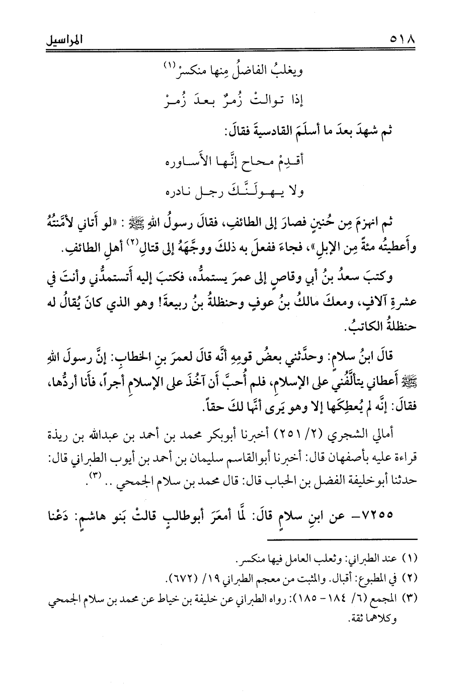 أمالي الشجري (2/ 251) أخبرنا أبوبكر محمد بن أحمد بن عبدالله بن ريذة قراءة عليه بأصفهان قال: أخبرنا أبوالقاسم سليمان بن أحمد بن أيوب الطبراني قال: حدثنا أبوخليفة الفضل بن الحباب قال: قال محمد بن سلام الجمحي .. (¬3).