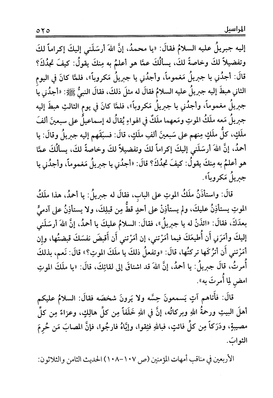 قالَ: واستأذَنُ ملَكُ الموتِ على البابِ، فقالَ له جبريلُ: يا أحمدُ، هذا ملَكُ الموتِ يستأذِنُ عليكَ، ولم يستأذِنْ على أحدٍ قطُّ مِن قبلِكَ، ولا يستأذِنُ على آدميٍّ بعدَكَ، فقالَ: «ائذَنْ له يا جبريلُ»، فقالَ: السلامُ عليكَ يا أحمدُ، إنَّ اللهَ أرسَلَني إليكَ وأمَرَني أَن أُطيعَكَ فيما أمَرْتني، إن أمَرْتني أَن أَقبضَ نفسَكَ قبضتُها، وإِن أمَرْتني أَن أترُكَها تركتُها، قالَ: «وتفعلُ ذلكَ يا ملَكَ الموتِ؟» قالَ: نَعم، بذلكَ أُمرتُ، قالَ جبريلُ: يا أحمدُ، إنَّ اللهَ قد اشتاقَ إلى لقائِكَ، قالَ: «يا ملَكَ الموتِ امضِ لِما أُمرتَ به».