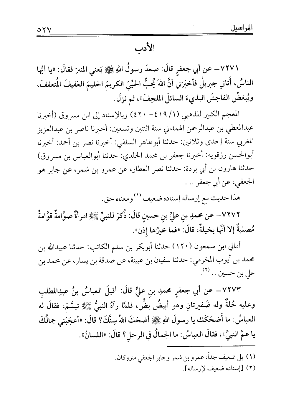 7273 - عن أبي جعفرٍ محمدِ بنِ عليٍّ قالَ: أقبلَ العباسُ بنُ عبدِالمطلبِ وعليه حُلةٌ وله ضَفيرتانِ وهو أبيضُ بضٌّ، فلمَّا رآهُ النبيُّ صلى الله عليه وسلم تبسَّمَ، فقالَ له العباسُ: ما أَضحَكَك يا رسولَ اللهِ صلى الله عليه وسلم أضحَكَ اللهُ سِنَّكَ؟ قالَ: «أعجَبَني جمالُكَ يا عمَّ النبيِّ»، فقالَ العباسُ: ما الجمالُ في الرجلِ؟ قالَ: «اللسانُ».