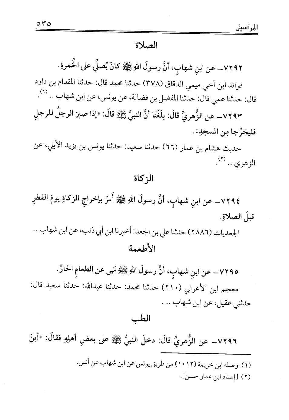 الجعديات (2886) حدثنا علي بن الجعد: أخبرنا ابن أبي ذئب، عن ابن شهاب ..