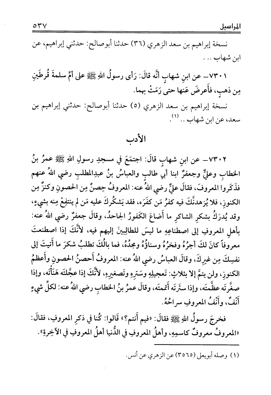 7302 - عن ابنِ شهابٍ قالَ: اجتمَعَ في مسجدِ رسولِ اللهِ صلى الله عليه وسلم عمرُ بنُ الخطابِ وعليٌّ وجعفرٌ ابنا أبي طالبٍ والعباسُ بنُ عبدِالمطلبِ رضي اللهُ عنهم فذَكَروا المعروفَ، فقالَ عليٌّ رضي اللهُ عنه: المعروفُ حِصنٌ مِن الحصونِ وكنزٌ مِن الكنوزِ، فلا يُزهدنَّكَ فيه كفرُ مَن كفَرَه، فقد يَشكُركَ عليه مَن لم ينتفِعْ مِنه بشيءٍ، وقد يُدرَكُ بشكرِ الشاكرِ ما أَضاعَ الكَفورُ الجاحدُ، وقالَ جعفرٌ رضي اللهُ عنه: بأهلِ المعروفِ إلى اصطناعِهِ ما ليسَ للطالِبينَ إليهم فيه، لأنَّكَ إذا اصطنعتَ معروفاً كانَ لكَ أجرُهُ وفخرُهُ وسناؤُهُ ومجدُهُ، فما بالُكَ تطلبُ شكرَ ما أَتيتَ إلى نفسِكَ مِن غيرِكَ، وقالَ العباسُ رضي اللهُ عنه: المعروفُ أَحصنُ الحصونِ وأَعظمُ الكنوزِ، ولن يتمَّ إلا بثلاثٍ: تَعجيلِهِ وسَترِهِ وتَصغيرِهِ، لأنَّكَ إذا عجَّلتَه هَنَأْتَه، وإذا صغَّرتَه عظَّمتَه، وإذا ستَرتَه أَتممتَه، وقالَ عمرُ بنُ الخطابِ رضي اللهُ عنه: لكلِّ شيءٍ أَنْفٌ، وأَنْفُ المعروفِ سراحُهُ.