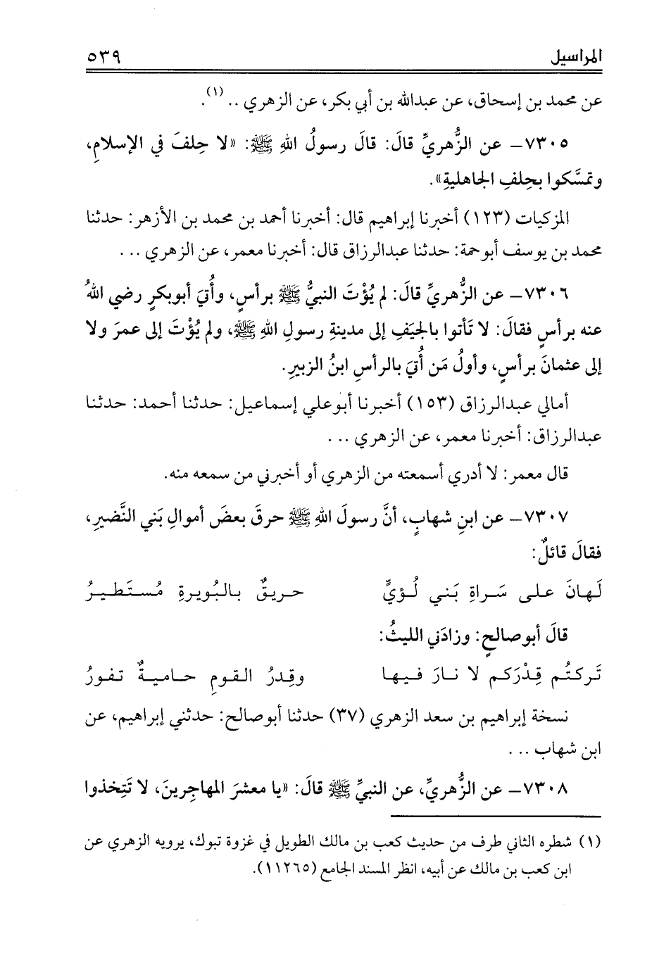 7305 - عن الزُّهريِّ قالَ: قالَ رسولُ اللهِ صلى الله عليه وسلم: «لا حِلفَ في الإسلامِ، وتمسَّكوا بحِلفِ الجاهليةِ».