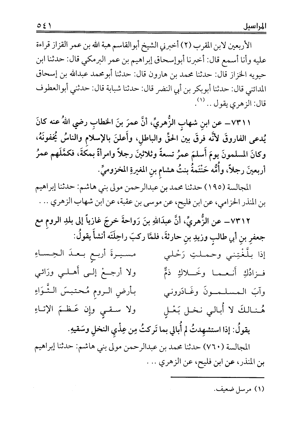 المجالسة (195) حدثنا محمد بن عبدالرحمن مولى بني هاشم: حدثنا إبراهيم بن المنذر الحزامي، عن ابن فليح، عن موسى بن عقبة، عن ابن شهاب الزهري .. .