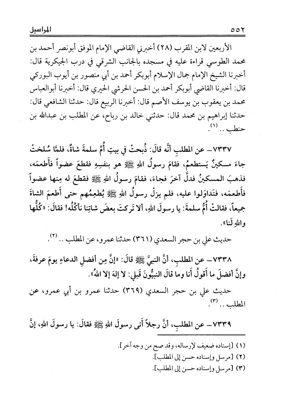 حديث علي بن حجر السعدي (369) حدثنا عمرو بن أبي عمرو، عن المطلب .. (¬3).