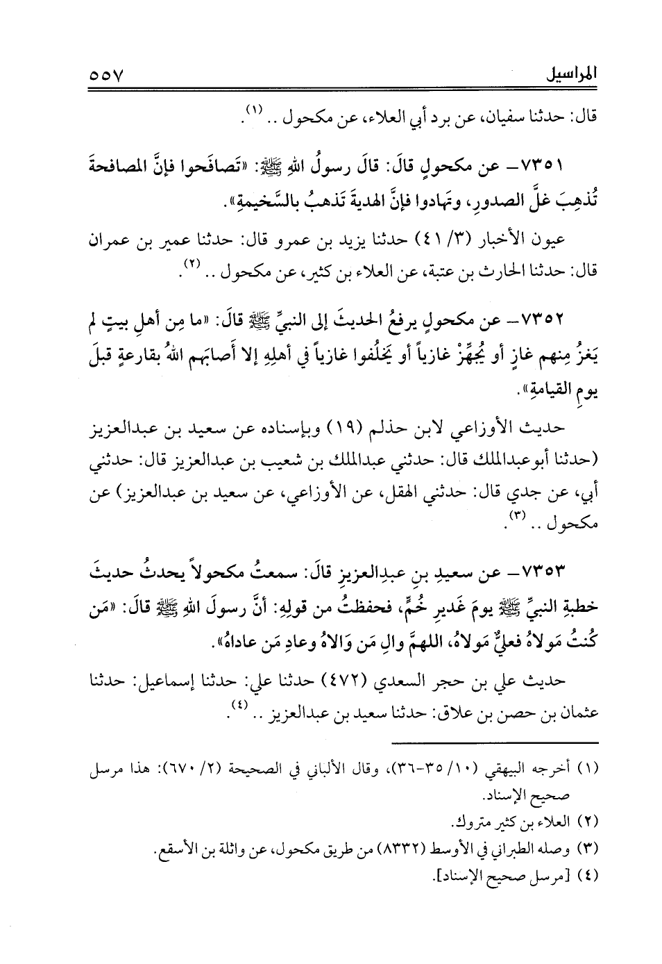 7351 - عن مكحولٍ قالَ: قالَ رسولُ اللهِ صلى الله عليه وسلم: «تَصافَحوا فإنَّ المصافحةَ تُذهِبَ غلَّ الصدورِ، وتَهادوا فإنَّ الهديةَ تَذهبُ بالسَّخيمةِ».