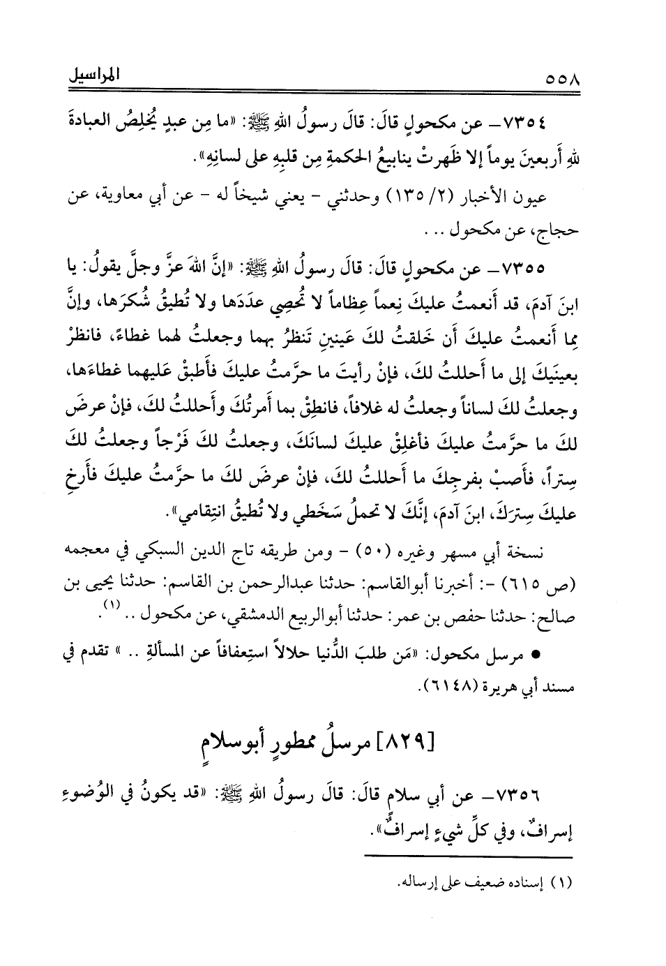 7354 - عن مكحولٍ قالَ: قالَ رسولُ اللهِ صلى الله عليه وسلم: «ما مِن عبدٍ يُخلِصُ العبادةَ للهِ أَربعينَ يوماً إلا ظَهرتْ ينابيعُ الحكمةِ مِن قلبِهِ على لسانِهِ».