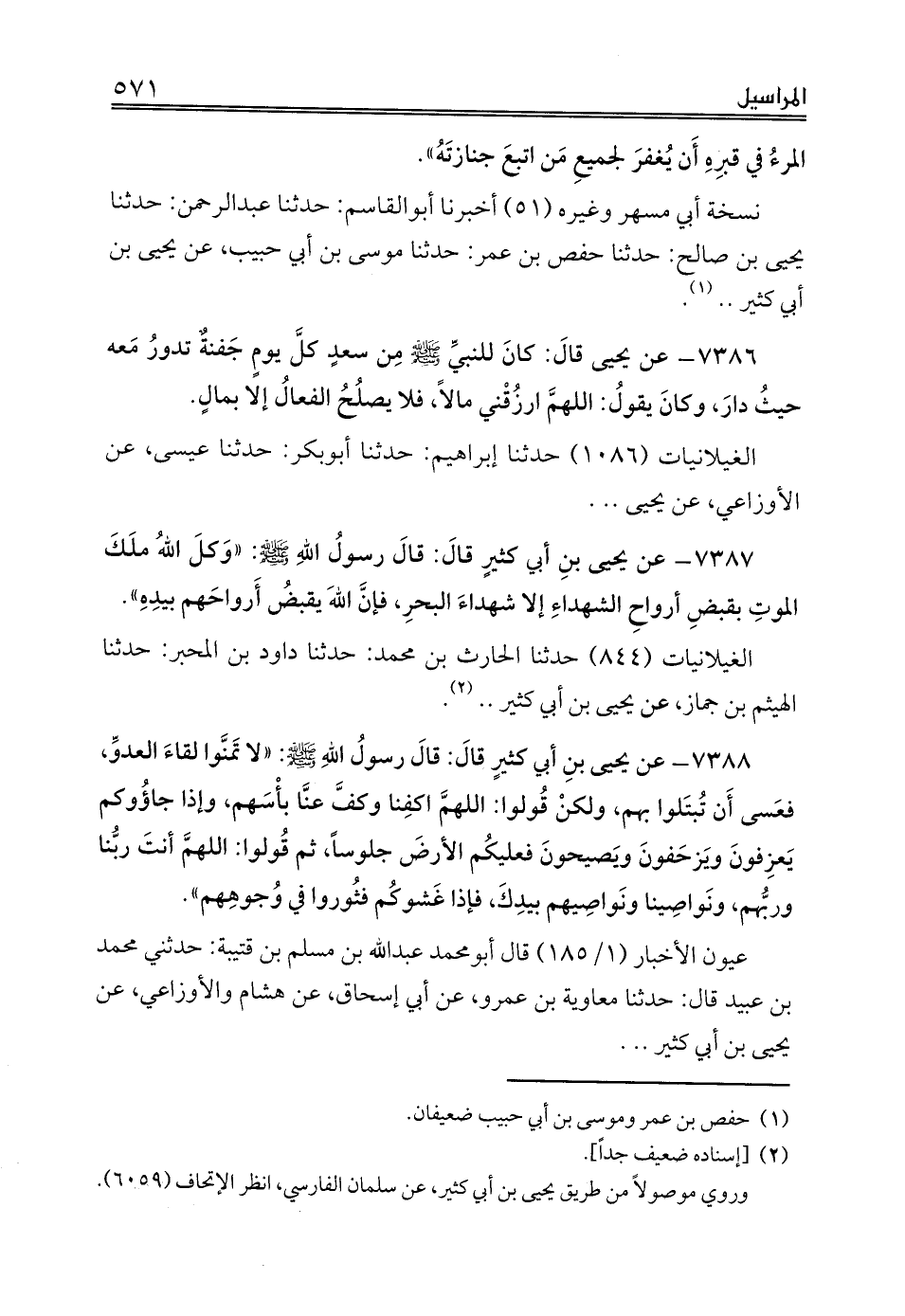 7388 - عن يحيى بنِ أبي كثيرٍ قالَ: قالَ رسولُ اللهِ صلى الله عليه وسلم: «لا تَمنَّوا لقاءَ العدوِّ، فعَسى أَن تُبتَلوا بهم، ولكنْ قُولوا: اللهمَّ اكفِنا وكفَّ عنَّا بأْسَهم، وإذا جاؤُوكم يَعزِفونَ ويَزحَفونَ ويَصيحونَ فعليكُم الأرضَ جلوساً، ثم قُولوا: اللهمَّ أنتَ ربُّنا وربُّهم، ونَواصِينا ونَواصِيهم بيدِكَ، فإذا غَشوكُم فثُوروا في وُجوهِهم».