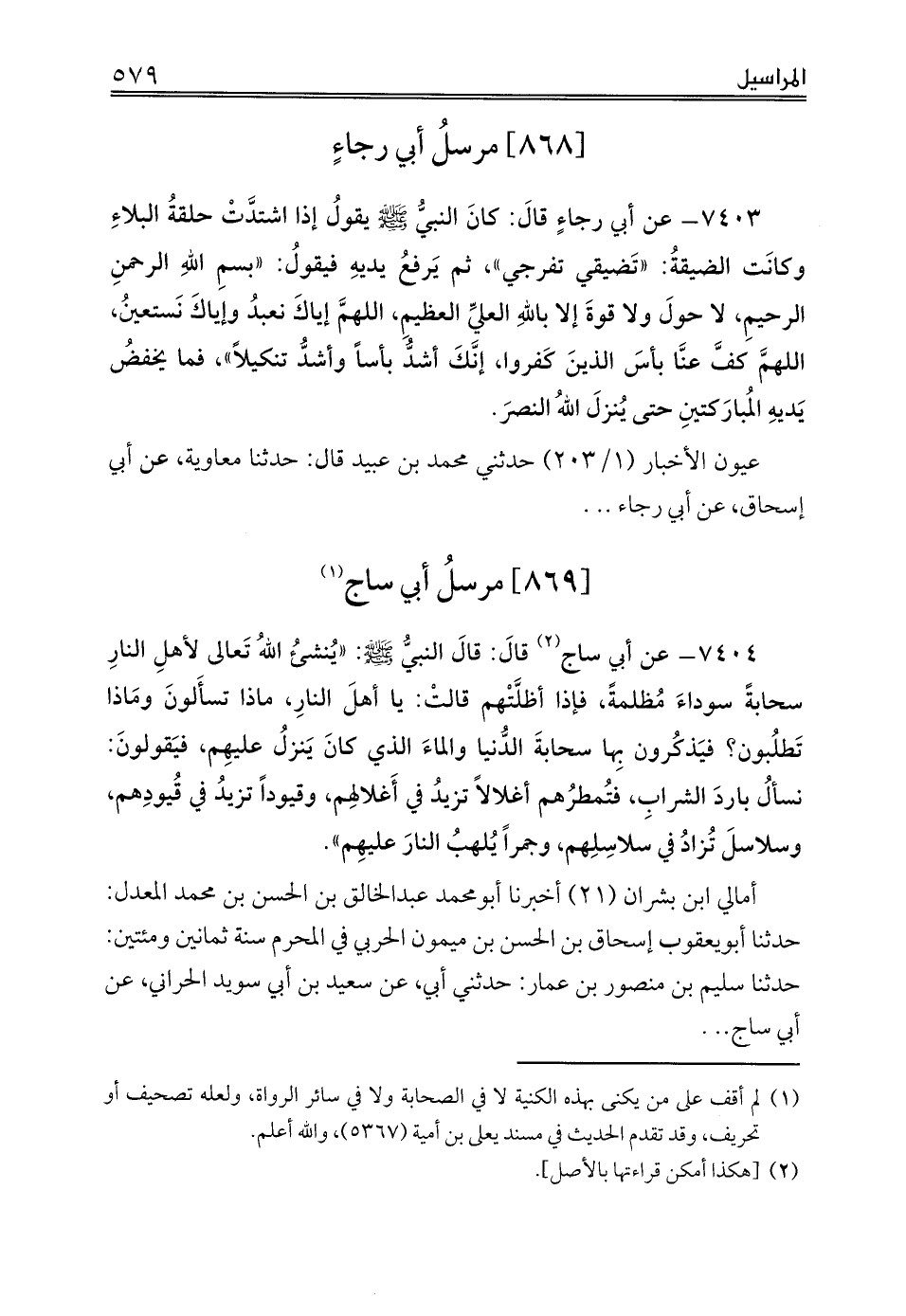 أمالي ابن بشران (21) أخبرنا أبومحمد عبدالخالق بن الحسن بن محمد المعدل: حدثنا أبويعقوب إسحاق بن الحسن بن ميمون الحربي في المحرم سنة ثمانين ومئتين: حدثنا سليم بن منصور بن عمار: حدثني أبي، عن سعيد بن أبي سويد الحراني، عن أبي ساج .. .