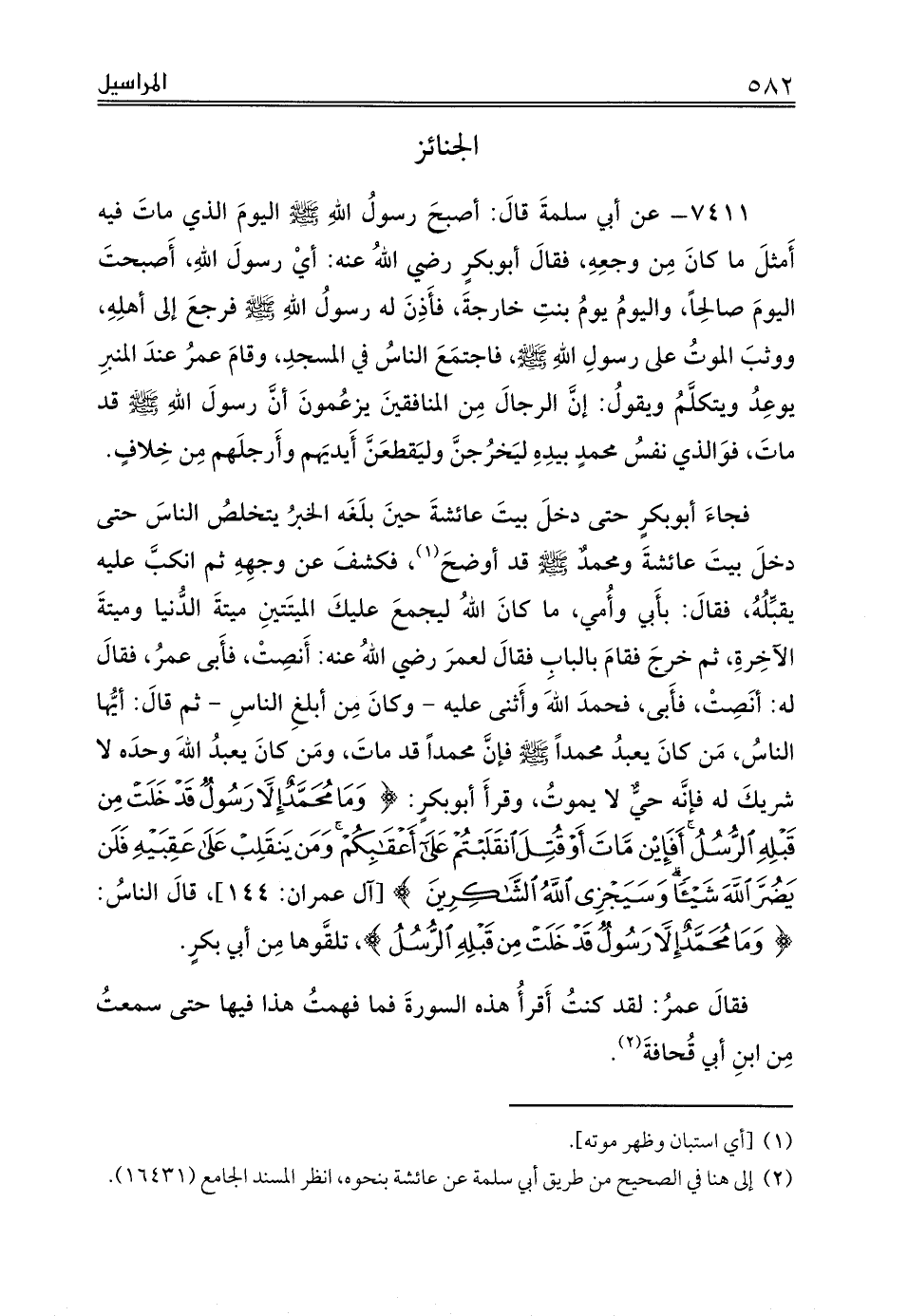 7411 - عن أبي سلمةَ قالَ: أصبحَ رسولُ اللهِ صلى الله عليه وسلم اليومَ الذي ماتَ فيه أَمثلَ ما كانَ مِن وجعِهِ، فقالَ أبوبكرٍ رضي اللهُ عنه: أيْ رسولَ اللهِ، أَصبحتَ اليومَ صالِحاً، واليومُ يومُ بنتِ خارجةَ، فأَذِنَ له رسولُ اللهِ صلى الله عليه وسلم فرجعَ إلى أهلِهِ، ووثبَ الموتُ على رسولِ اللهِ صلى الله عليه وسلم، فاجتمَعَ الناسُ في المسجدِ، وقامَ عمرُ عندَ المنبرِ يوعِدُ ويتكلَّمُ ويقولُ: إنَّ الرجالَ مِن المنافقينِ يزعُمونَ أنَّ رسولَ اللهِ صلى الله عليه وسلم قد ماتَ، فوَالذي نفسُ محمدٍ بيدِهِ ليَخرُجنَّ وليَقطعَنَّ أَيديَهم وأَرجلَهم مِن خِلافٍ.