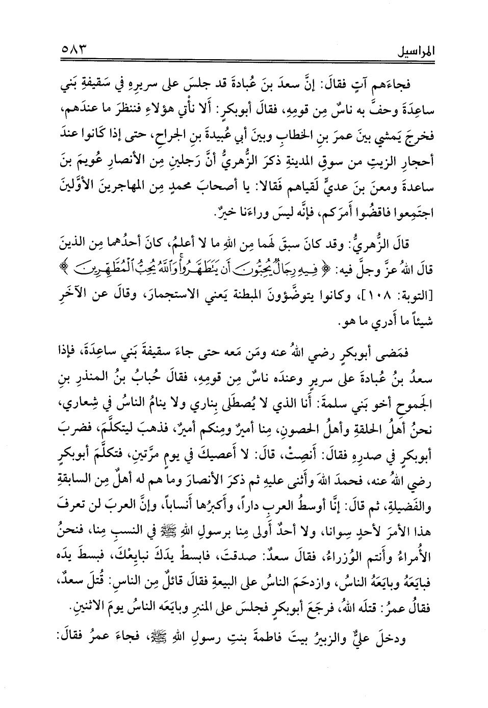 فجاءَهم آتٍ فقالَ: إنَّ سعدَ بنَ عُبادةَ قد جلسَ على سريرِهِ في سَقيفةِ بَني ساعِدَةَ وحفَّ به ناسٌ مِن قومِهِ، فقالَ أبوبكرٍ: أَلا نأْتي هؤلاءِ فننظرَ ما عندَهم، فخرجَ يَمشي بينَ عمرَ بنِ الخطابِ وبينَ أبي عُبيدةَ بنِ الجراحِ، حتى إذا كَانوا عندَ أحجارِ الزيتِ من سوقِ المدينةِ ذكرَ الزُّهريُّ أنَّ رَجلينِ مِن الأنصارِ عُويمَ بنَ ساعدةَ ومعنَ بنَ عديِّ لَقياهم فَقالا: يا أصحابَ محمدٍ مِن المهاجرينَ الأوَّلينَ اجتَمِعوا فاقضُوا أَمرَكم، فإنَّه ليسَ وراءَنا خيرٌ.