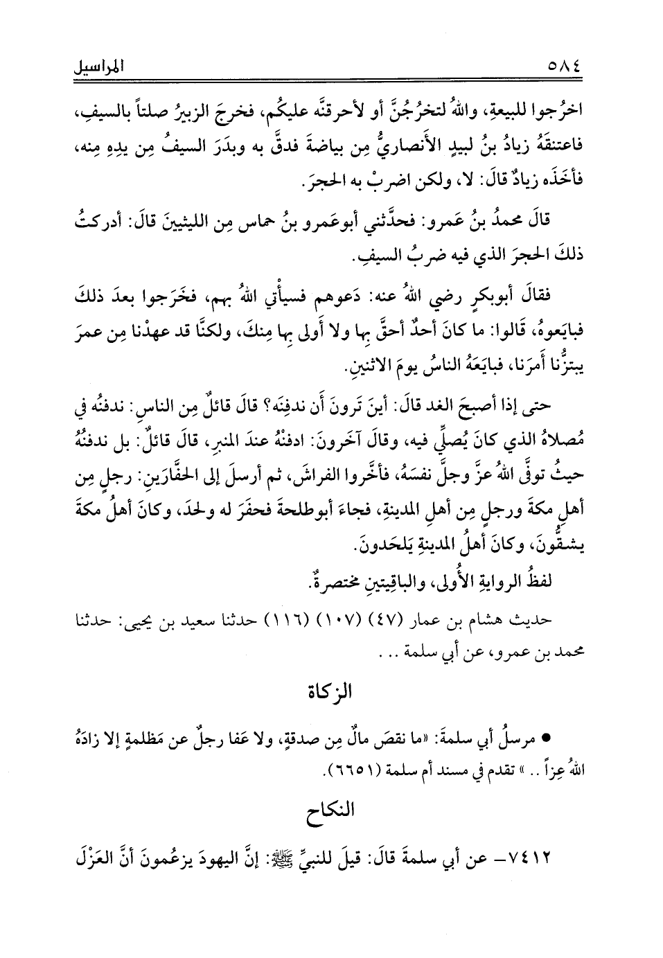 اخرُجوا للبيعةِ، واللهُ لتخرُجُنَّ أو لأحرقنَّه عليكُم، فخرجَ الزبيرُ صلتاً بالسيفِ، فاعتنقَهُ زيادُ بنُ لبيدٍ الأَنصاريُّ مِن بياضةَ فدقَّ به وبدَرَ السيفُ مِن يدِهِ مِنه، فأخَذَه زيادٌ قالَ: لا، ولكن اضربْ به الحجرَ.