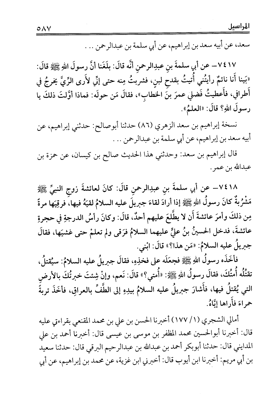 7418 - عن أبي سلمةَ بنِ عبدِالرحمنِ قالَ: كانَ لعائشةَ زوجِ النبيِّ صلى الله عليه وسلم مَشْرُبةٌ كانَ رسولُ اللهِ صلى الله عليه وسلم إذا أرادَ لقاءَ جبريلَ عليه السلامُ لقيَهُ فيها، فرقِيَها مرةً مِن ذلكَ وأمرَ عائشةَ أَن لا يطَّلعَ عليهم أحدٌ، قالَ: وكانَ رأسُ الدرجةِ في حجرةِ عائشةَ، فدخل الحسينُ بنُ عليٍّ عليهما السلامُ فرَقى ولم تعلمْ حتى غشيَها، فقالَ جبريلُ عليه السلامُ: «مَن هذا؟» قالَ: ابْني.
