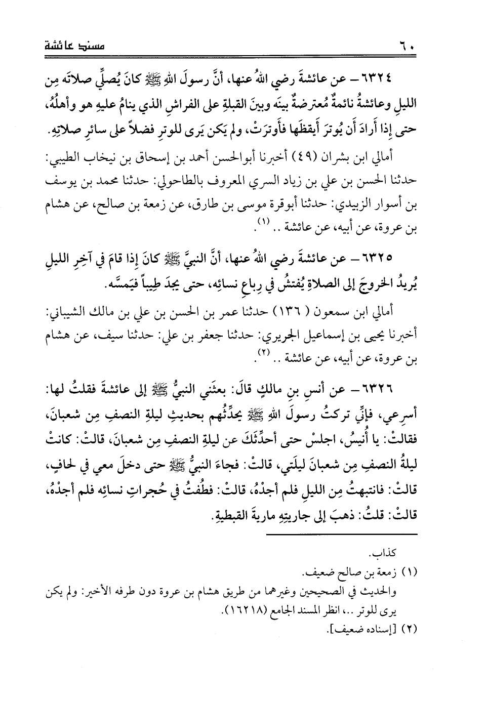 حدثنا الحسن بن علي بن زياد السري المعروف بالطاحولي: حدثنا محمد بن يوسف بن أسوار الزبيدي: حدثنا أبوقرة موسى بن طارق، عن زمعة بن صالح، عن هشام بن عروة، عن أبيه، عن عائشة .. (¬1).