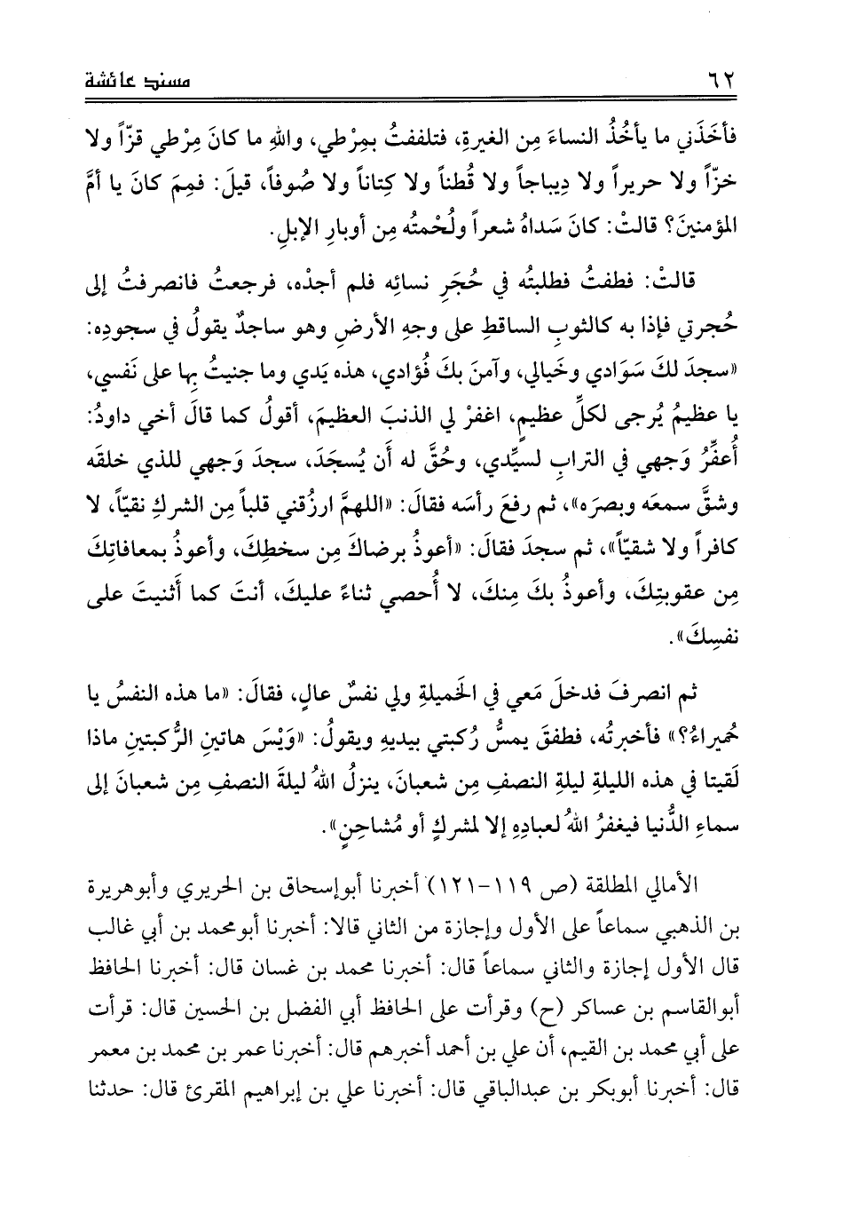 ثم انصرفَ فدخلَ مَعي في الخَميلةِ ولي نفسٌ عالٍ، فقالَ: «ما هذه النفسُ يا حُميراءُ؟» فأخبرتُه، فطفقَ يمسُّ رُكبتي بيديهِ ويقولُ: «وَيْسَ هاتينِ الرُّكبتينِ ماذا لَقيتا في هذه الليلةِ ليلةِ النصفِ مِن شعبانَ، ينزلُ اللهُ ليلةَ النصفِ مِن شعبانَ إلى سماءِ الدُّنيا فيغفرُ اللهُ لعبادِهِ إلا لمشركٍ أو مُشاحِنٍ».