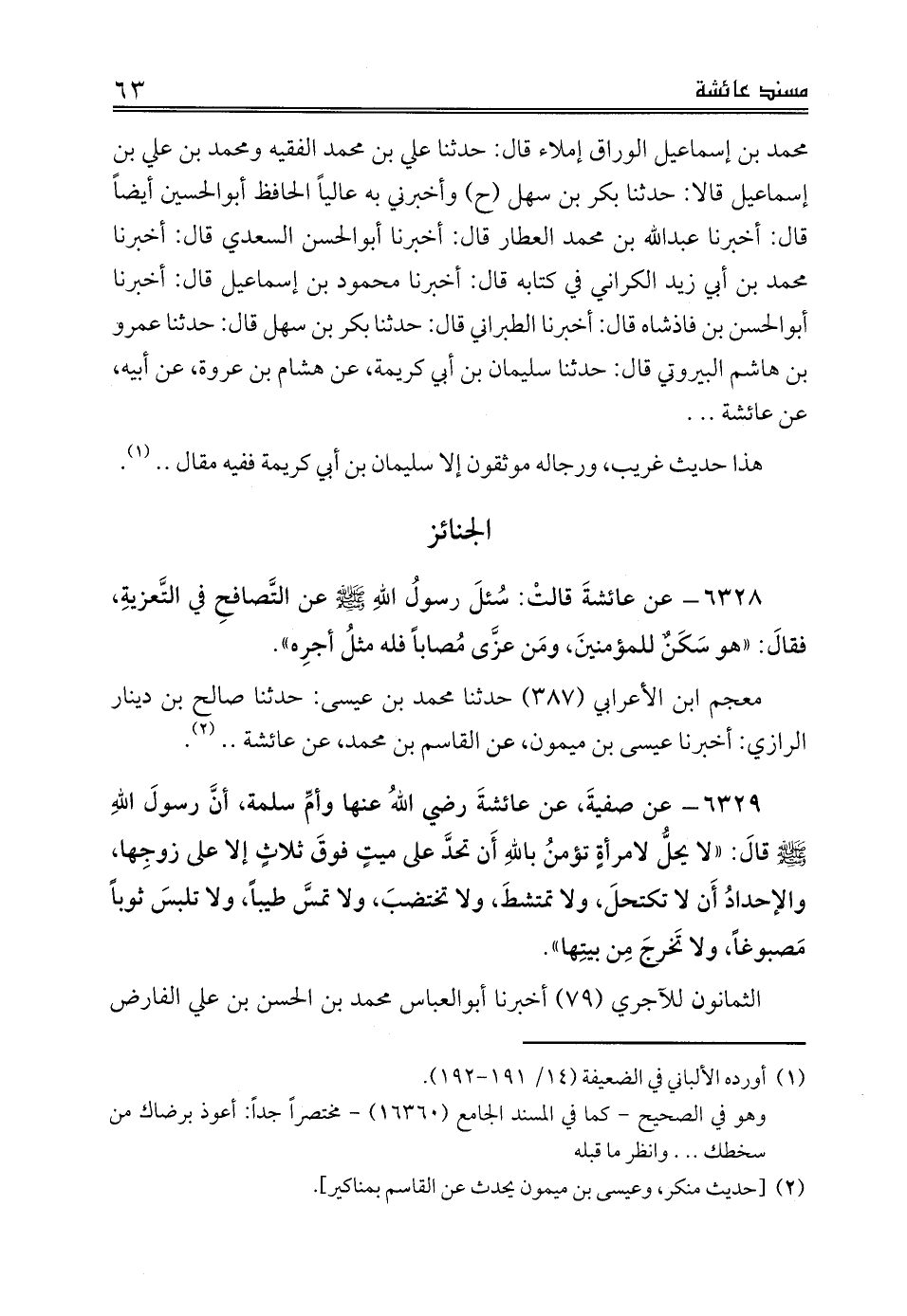 محمد بن أبي زيد الكراني في كتابه قال: أخبرنا محمود بن إسماعيل قال: أخبرنا أبوالحسن بن فاذشاه قال: أخبرنا الطبراني قال: حدثنا بكر بن سهل قال: حدثنا عمرو بن هاشم البيروتي قال: حدثنا سليمان بن أبي كريمة، عن هشام بن عروة، عن أبيه، عن عائشة .. .