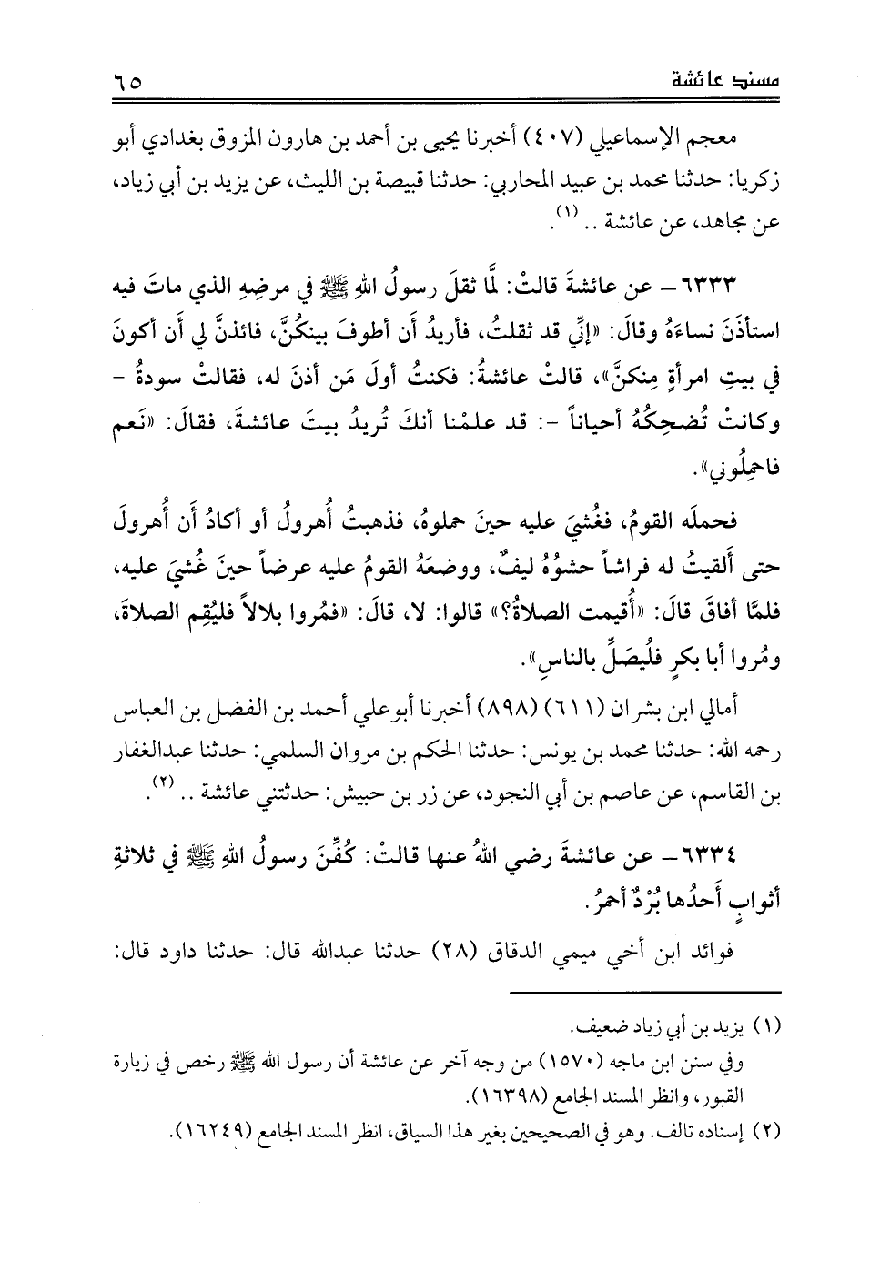 زكريا: حدثنا محمد بن عبيد المحاربي: حدثنا قبيصة بن الليث، عن يزيد بن أبي زياد، عن مجاهد، عن عائشة .. (¬1).