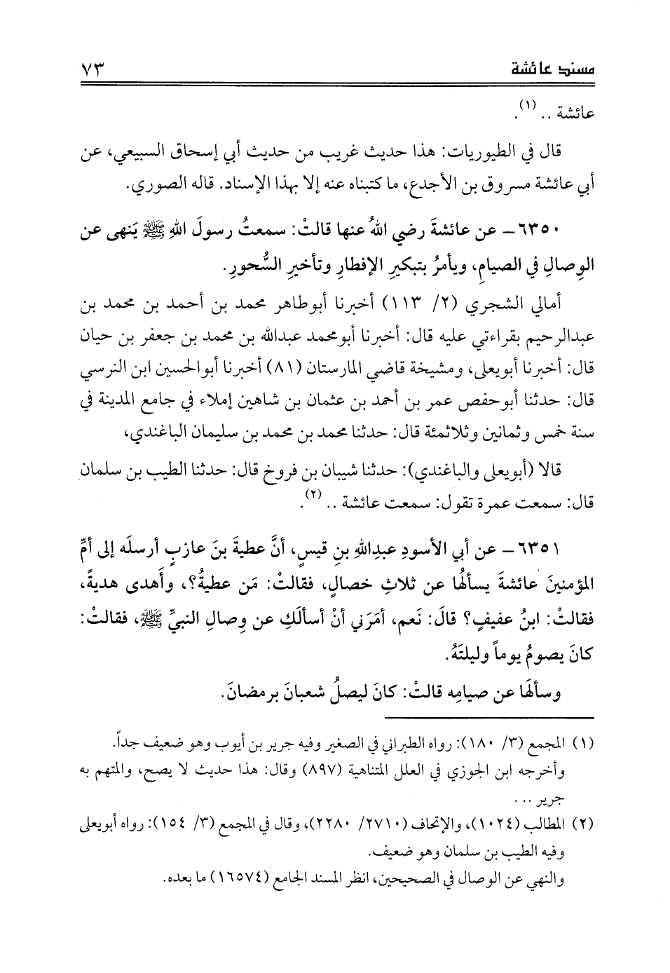 قالا (أبويعلى والباغندي): حدثنا شيبان بن فروخ قال: حدثنا الطيب بن سلمان قال: سمعت عمرة تقول: سمعت عائشة .. (¬2).