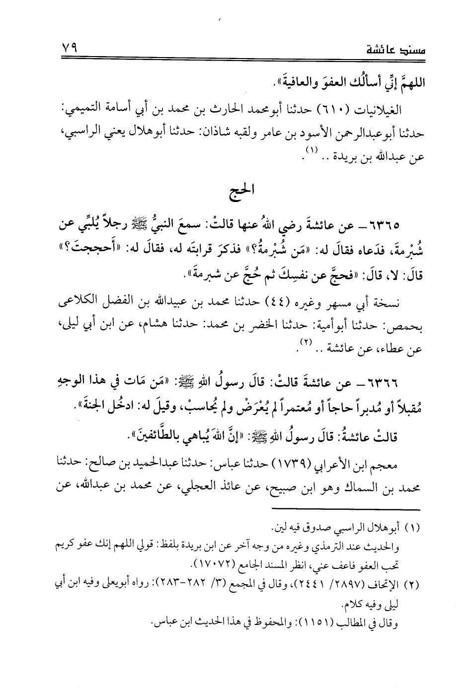 6366 - عن عائشةَ قالتْ: قالَ رسولُ اللهِ صلى الله عليه وسلم: «مَن مَات في هذا الوجهِ مُقبلاً أو مُدبراً حاجاً أو مُعتمراً لم يُعْرَضْ ولم يُحاسبْ، وقيلَ له: ادخُل الجنةَ».