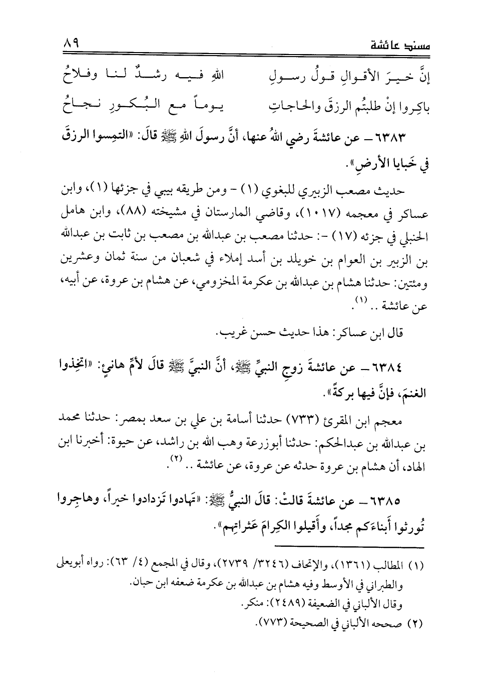 6385 - عن عائشةَ قالتْ: قالَ النبيُّ صلى الله عليه وسلم: «تَهادوا تَزدادوا خيراً، وهاجِروا تُورثوا أَبناءَكم مجداً، وأَقيلوا الكِرامَ عَثراتِهم».