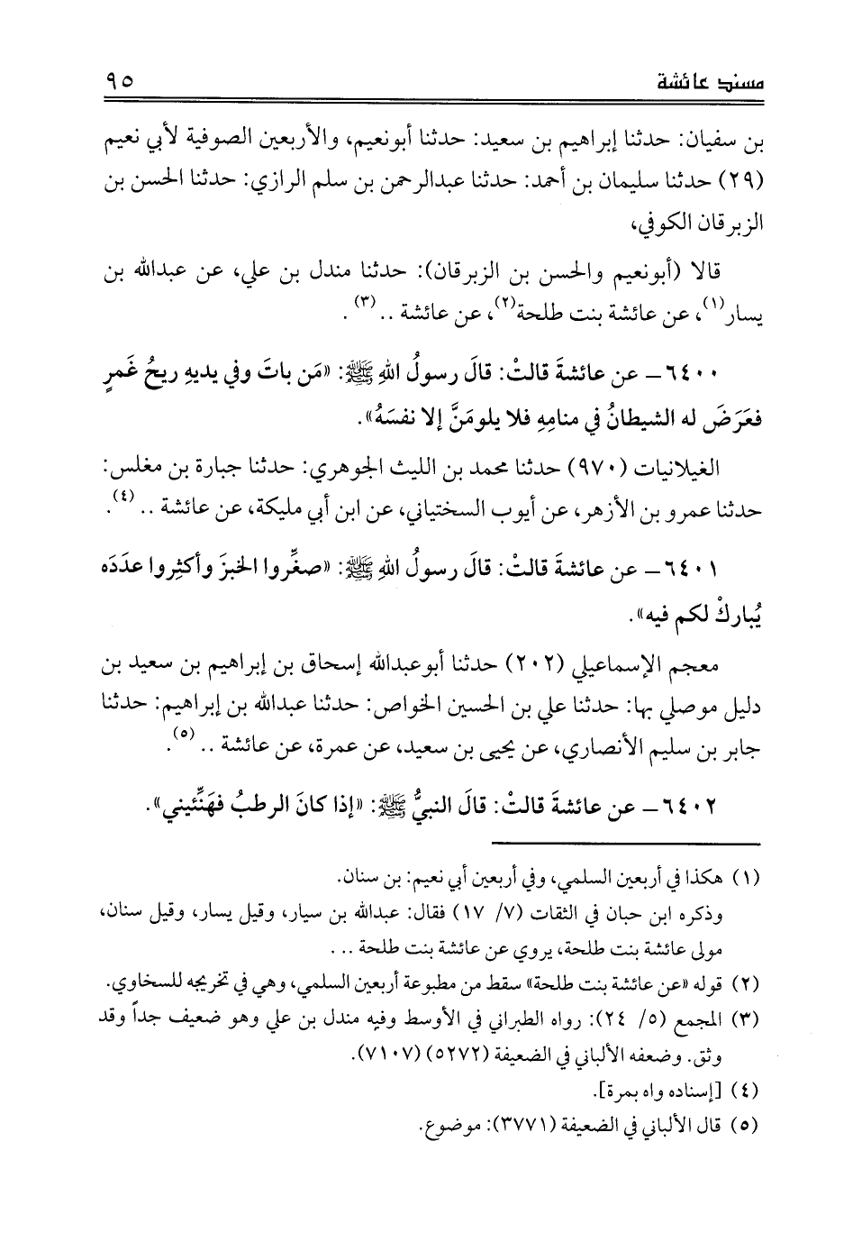قالا (أبونعيم والحسن بن الزبرقان): حدثنا مندل بن علي، عن عبدالله بن يسار (¬1)، عن عائشة بنت طلحة (¬2)، عن عائشة .. (¬3).