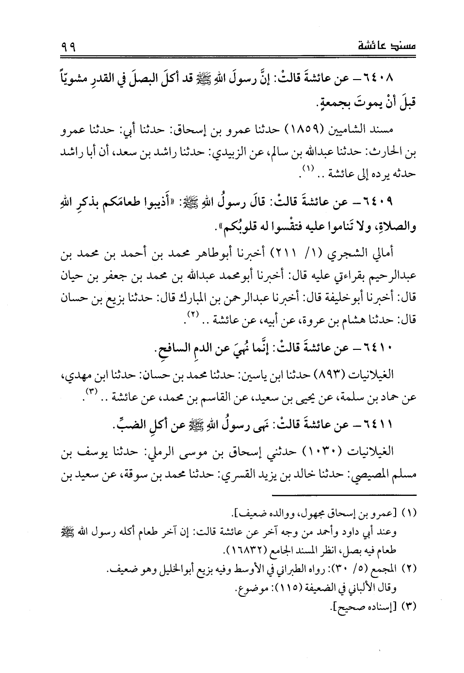 6408 - عن عائشةَ قالتْ: إنَّ رسولَ اللهِ صلى الله عليه وسلم قد أكلَ البصلَ في القدرِ مشويّاً قبلَ أنْ يموتَ بجمعةٍ.