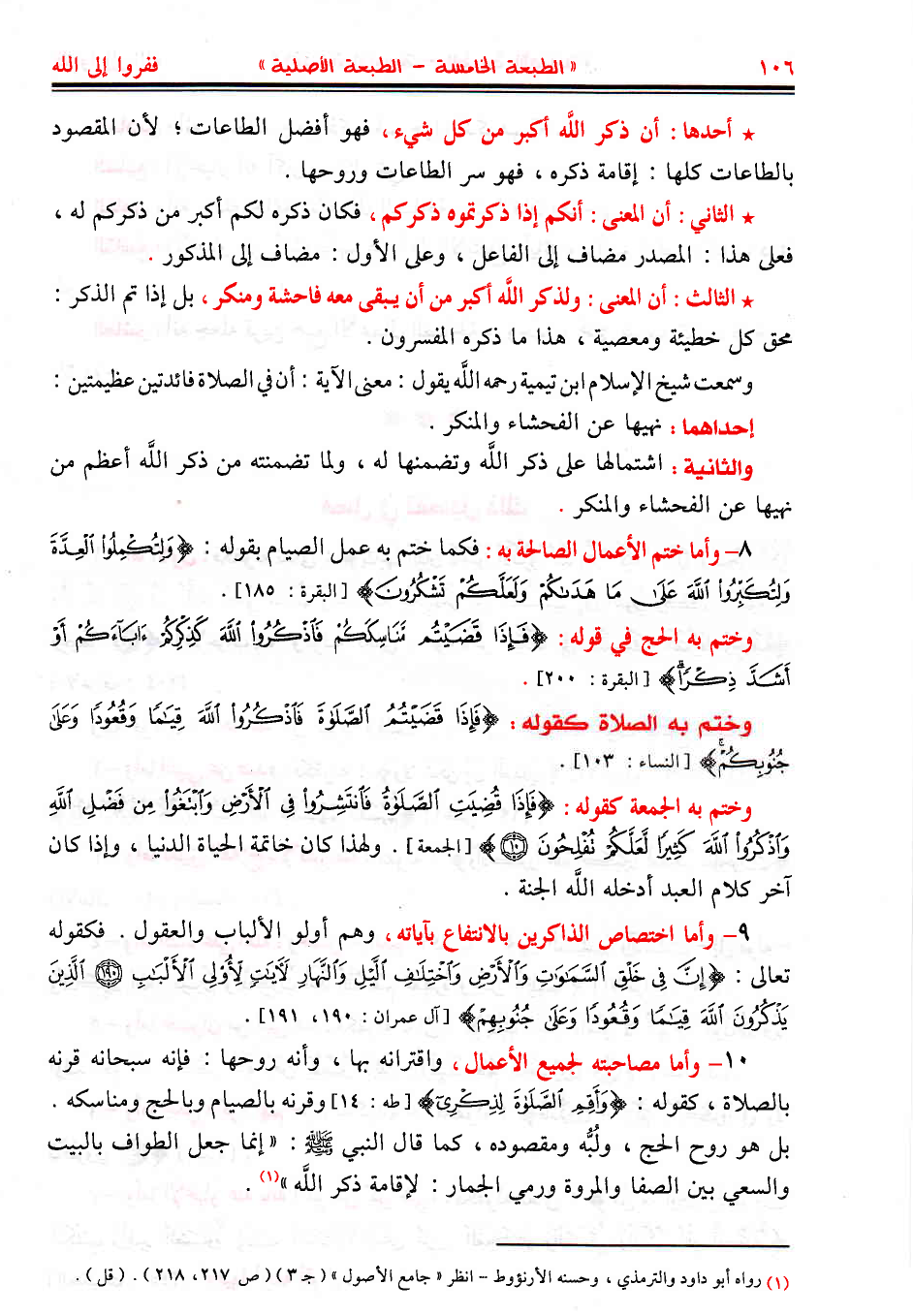 10 - وأما مصاحبته لجميع الأعمال، واقترانه بها، وأنه روحها: فإنه سبحانه قرنه بالصلاة، كقوله: {وَأَقِمِ الصَّلاَةَ لِذِكْرِي} [طه: 14] وقرنه بالصيام وبالحج ومناسكه. بل هو روح الحج، ولُبُّه ومقصوده، كما قال النبي - صَلَّى اللهُ عَلَيْهِ وَسَلَّمَ -: «إنما جعل الطواف بالبيت والسعي بين الصفا والمروة ورمي الجمار: لإقامة ذكر اللَّه» (¬1).