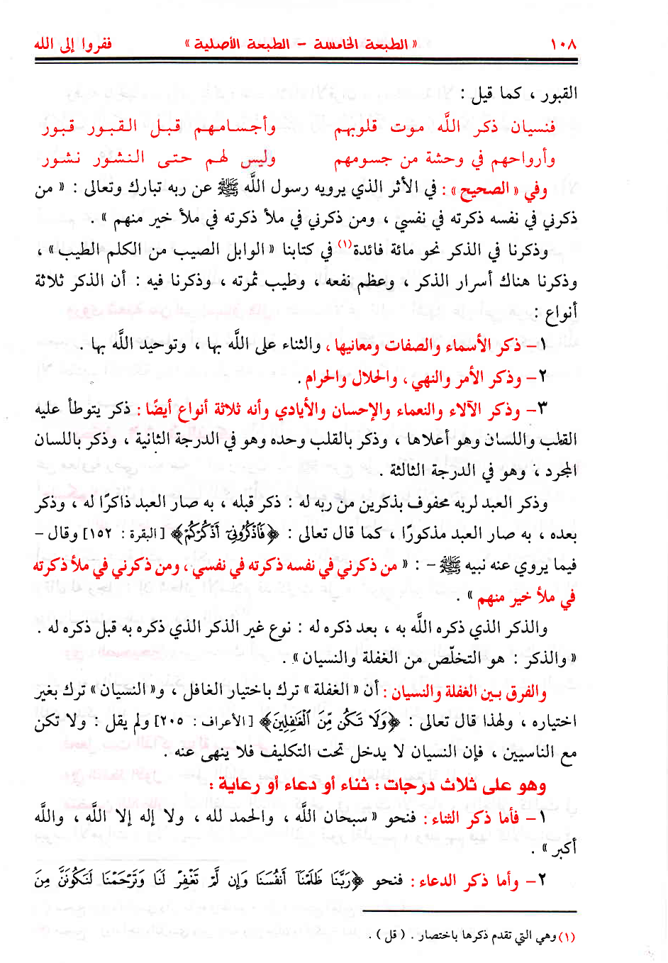 3 - وذكر الآلاء والنعماء والإحسان والأيادي وأنه ثلاثة أنواع أيضًا: ذكر يتوطأ عليه القلب واللسان وهو أعلاها، وذكر بالقلب وحده وهو في الدرجة الثانية، وذكر باللسان المجرد، وهو في الدرجة الثالثة.