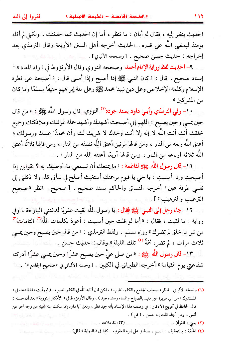9 - الحديث لفظ رواية الإمام أحمد وصححه النووي وقال الأرنؤوط في «زاد المعاد»: إسناد صحيح، قال: كان النبي - صَلَّى اللهُ عَلَيْهِ وَسَلَّمَ - إذا أصبح وإذا أمسى قال: «أصبحنا على فطرة الإسلام وكلمة الإخلاص وعلى دين نبينا محمد - صَلَّى اللهُ عَلَيْهِ وَسَلَّمَ - وعلى ملة إبراهيم حنيفًا مسلمًا وما كان من المشركين» ...