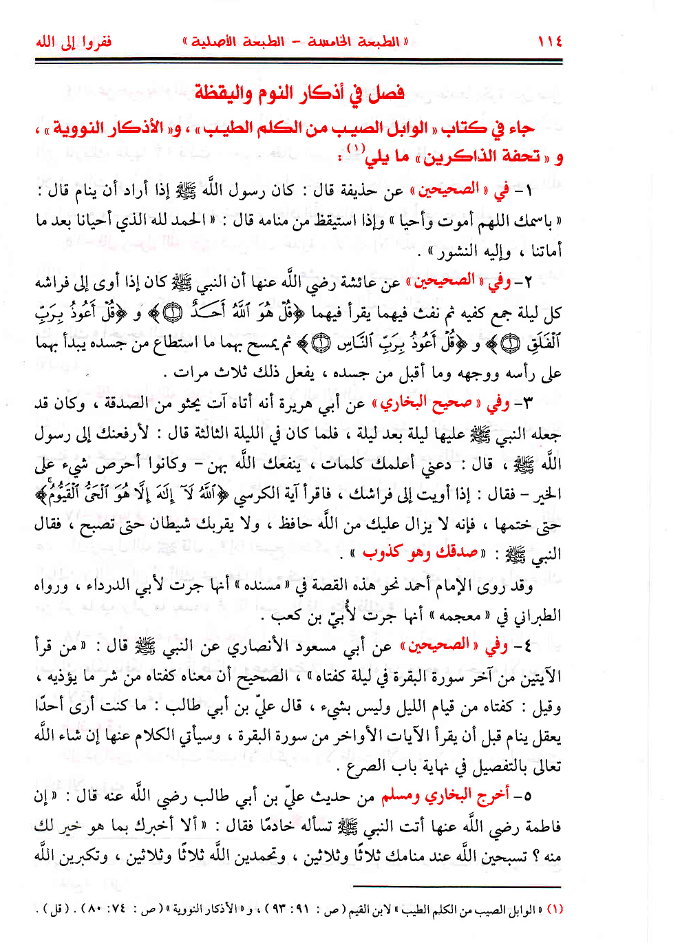 1 - في «الصحيحين» عن حذيفة قال: كان رسول اللَّه - صَلَّى اللهُ عَلَيْهِ وَسَلَّمَ - إذا أراد أن ينام قال: «باسمك اللهم أموت وأحيا» وإذا استيقظ من منامه قال: «الحمد لله الذي أحيانا بعد ما أماتنا، وإليه النشور».