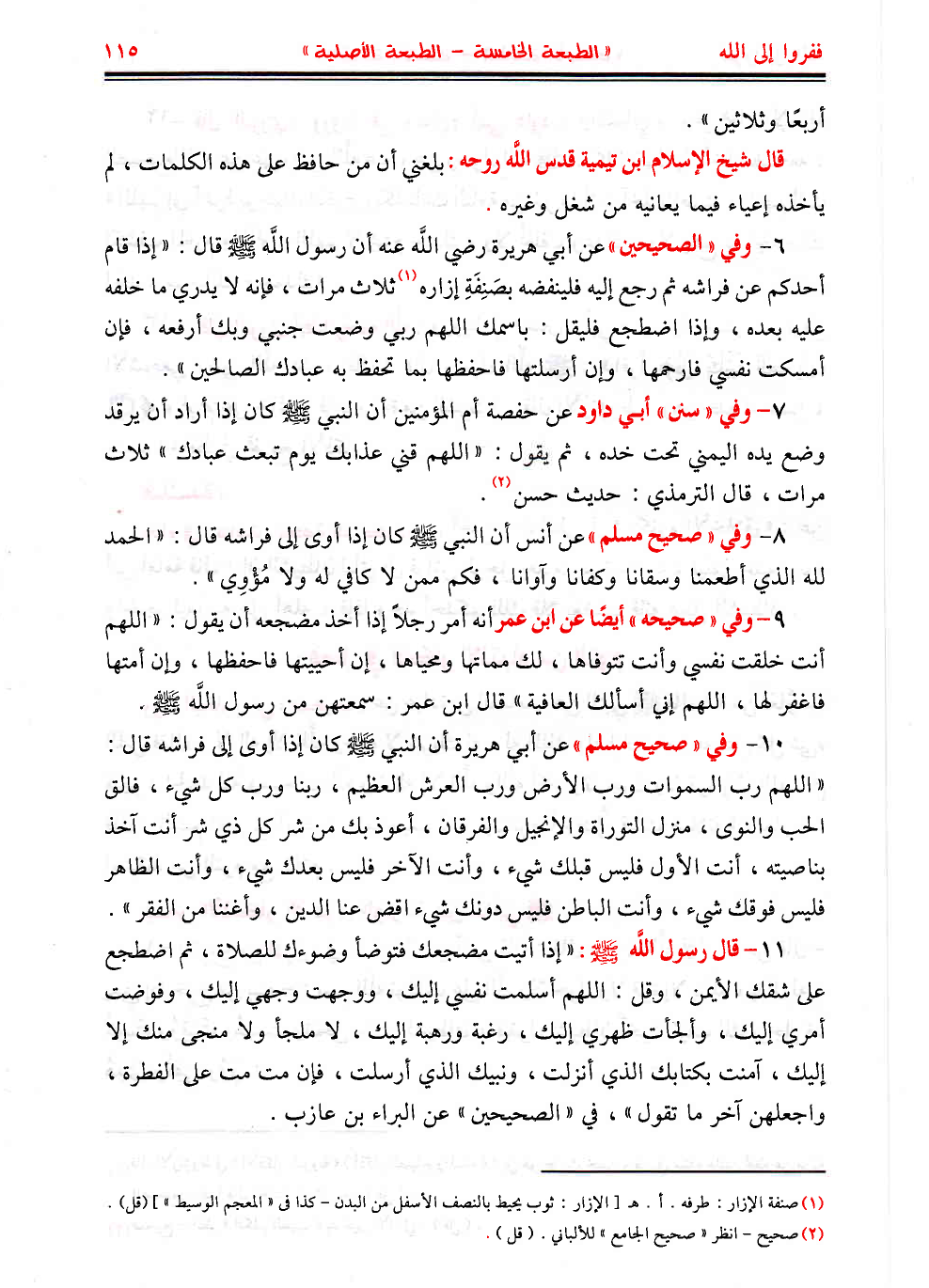 11 - قال رسول اللَّه - صَلَّى اللهُ عَلَيْهِ وَسَلَّمَ -: «إذا أتيت مضجعك فتوضأ وضوءك للصلاة، ثم اضطجع على شقك الأيمن، وقل: اللهم أسلمت نفسي إليك، ووجهت وجهي إليك، وفوضت أمري إليك، وألجأت ظهري إليك، رغبة ورهبة إليك، لا ملجأ ولا منجى منك إلا إليك، آمنت بكتابك الذي أنزلت، ونبيك الذي أرسلت، فإن مت مت على الفطرة، واجعلهن آخر ما تقول»، في «الصحيحين» عن البراء بن عازب.