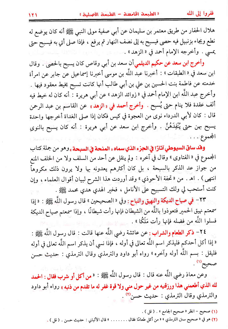 وأخرج ابن سعد عن حكيم الديلمي أن سعد بن أبي وقاص كان يسبح بالحصى. وقال ابن سعد في «الطبقات»: أخبرنا عبد اللَّه بن موسى أخبرنا إسماعيل عن جابر عن امرأة خدمته عن فاطمة بنت الحسين بن علي بن أبي طالب أنها كانت تسبح بخيط معقود فيها. وأخرج عبد اللَّه ابن الإمام أحمد في «زوائد الزهد» عن أبي هريرة أنه كان له خيط فيه ألف عقدة فلا ينام حتى يُسبح. وأخرج أحمد في «الزهد» عن القاسم بن عبد الرحمن قال: كان لأبي الدرداء نوى من العجوة في كيس فكان إذا صلى الغداة أخرجها واحدة يسبح بهن حتى ينفذهن. وأخرج ابن سعد عن أبي هريرة أنه كان يسبح بالنوى المجموع ...