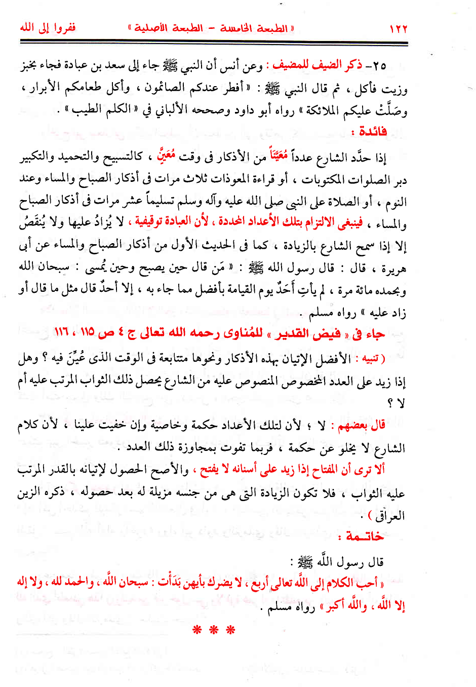 25 - ذكر الضيف للمضيف: وعن أنس أن النبي - صَلَّى اللهُ عَلَيْهِ وَسَلَّمَ - جاء إلى سعد بن عبادة فجاء بخبز وزيت فأكل، ثم قال النبي - صَلَّى اللهُ عَلَيْهِ وَسَلَّمَ -: «أفطر عندكم الصائمون، وأكل طعامكم الأبرار، وصلت عليكم الملائكة» رواه أبو داود وصححه الألباني في «الكلم الطيب».